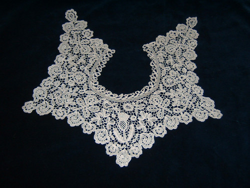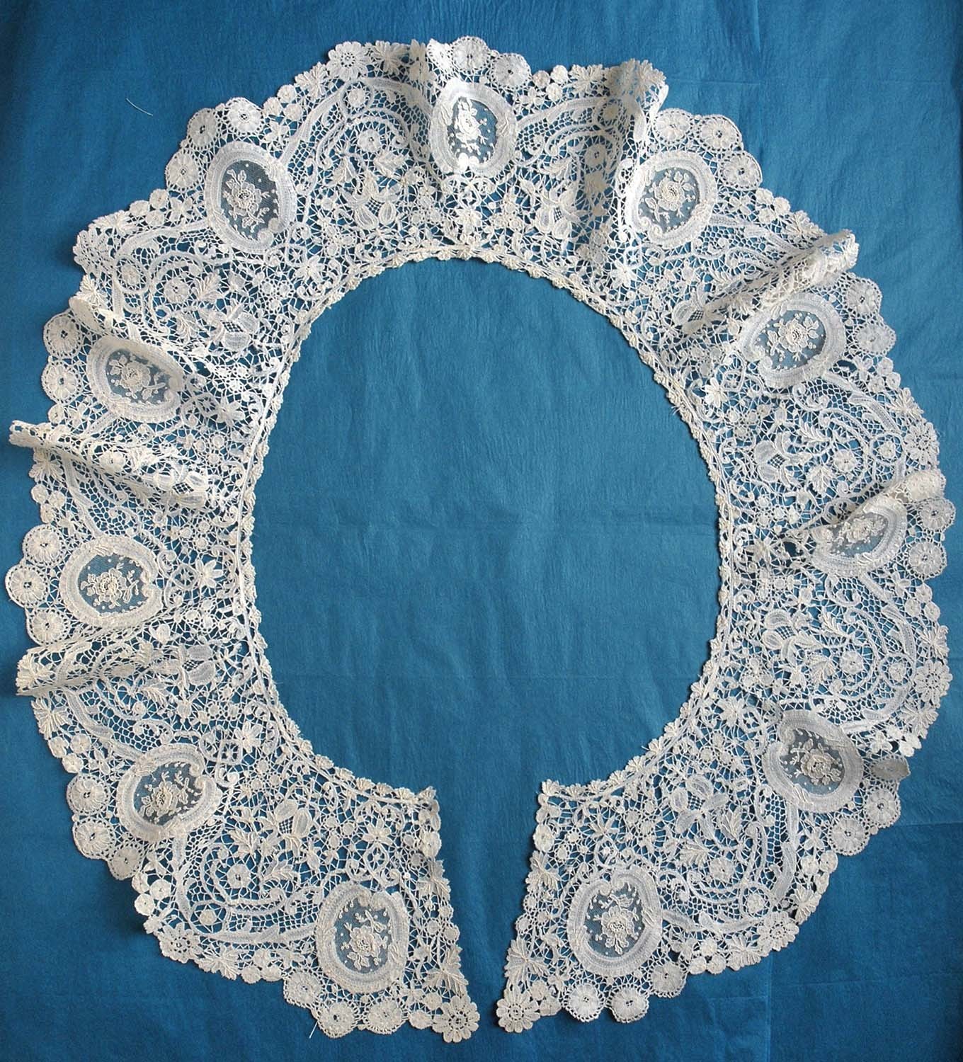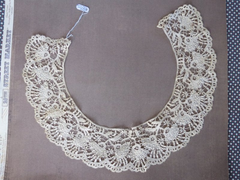 Comments: A small, interesting Bedfordshire collar. Quite a complex design, and note the raised work on the flowers. One small break center neck edge, otherwise very good condition.