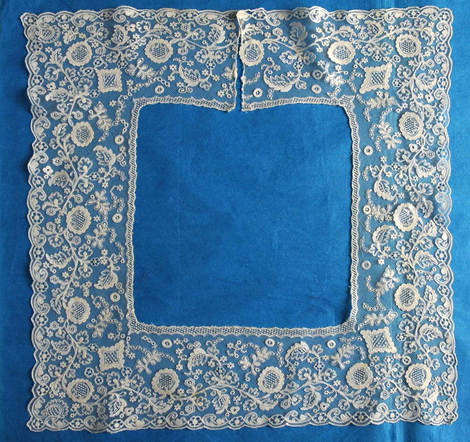 Comments: A Duchesse bobbinlace handkerchief, no Point de Gaze inserts. The design in the corners has a nice asymmetry. There is a little raised work on half stitch in the bobbinlace, and a few simple needlelace fillings in the centers of flowers. The piece looks a bit worn, maybe washed, but overall in very good condition.