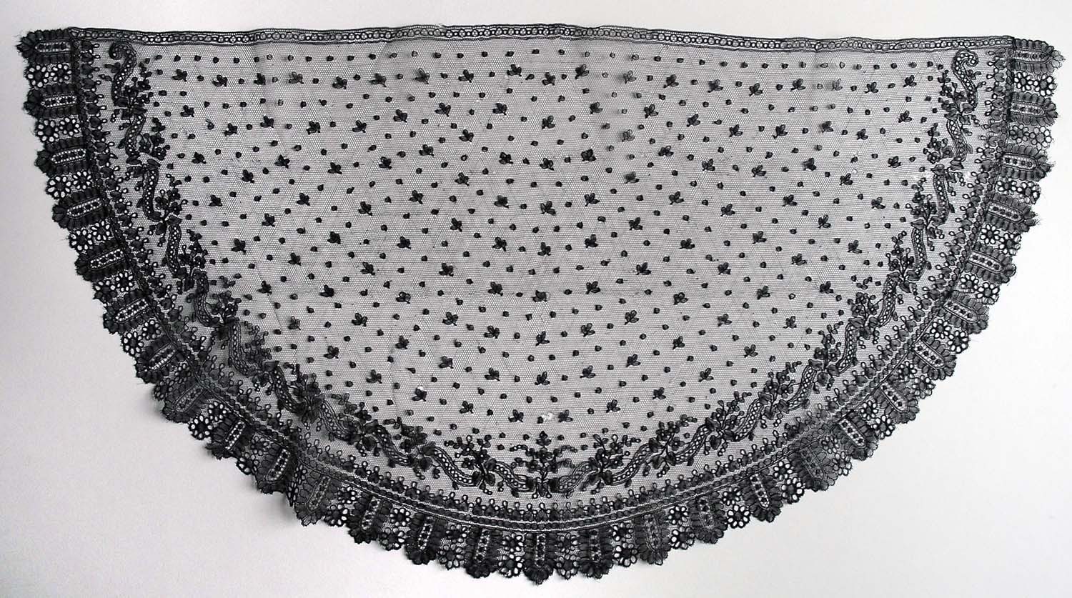 Comments: Ex. coll. Pat Earnshaw. A Chantilly semi-circular hat veil. I really like the attention the maker put into organizing the two different types of esprits to follow the oval pattern. And the edges are very well made. Overall this is a much better than average design for a hat veil. There are quite a few pinholes in the mesh, and a few small holes in the design. So condition is good, but the quality of the design makes up for a lot.