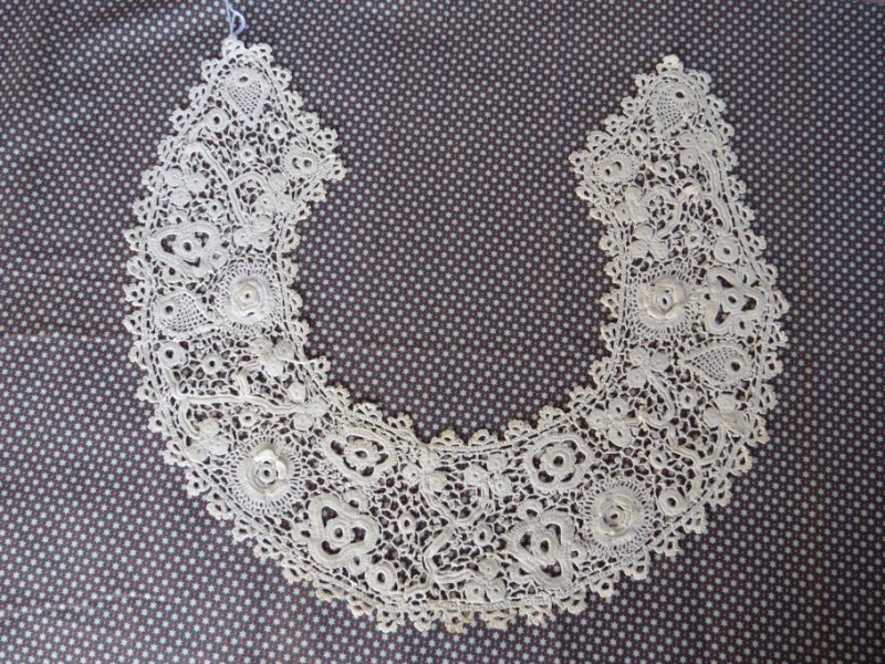 Comments: An Irish Crochet small collar. Design of shamrocks and flowers, raised work in roses and motif centers. The picots are crocheted loops. The design is symmetric but seems a little haphazard. Gives it a certain charm. Condition looks very good – seller does cite yellowing, although not very obvious from the photos.
