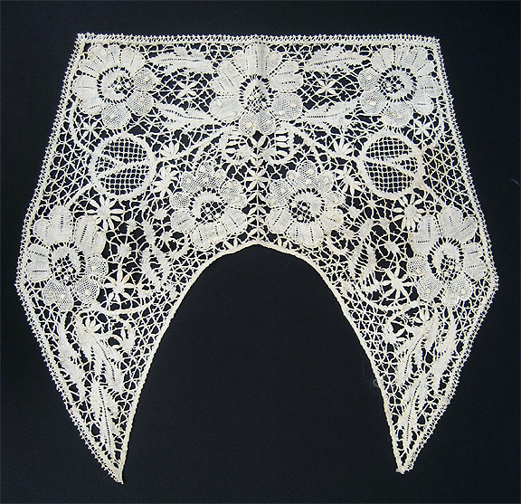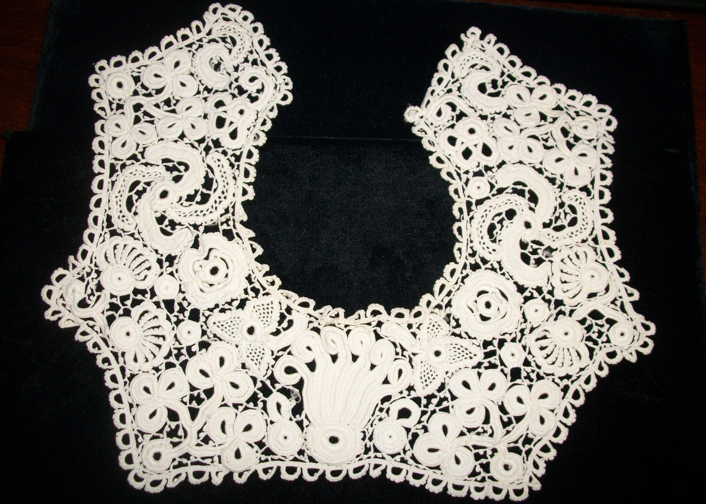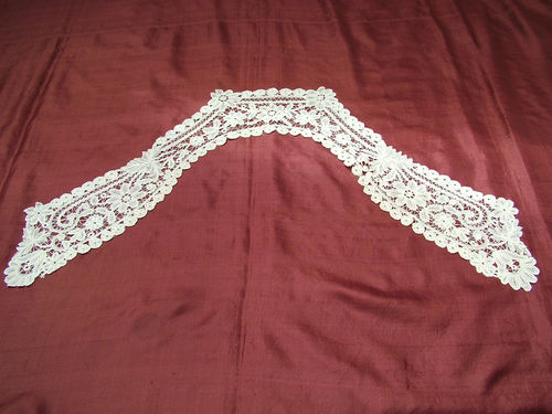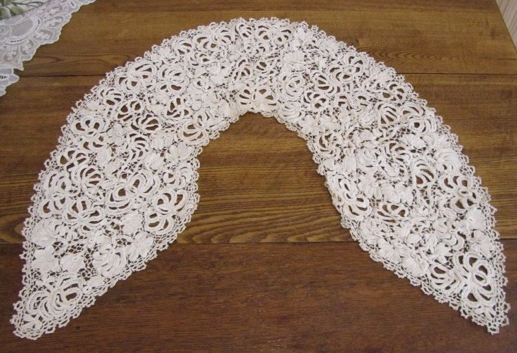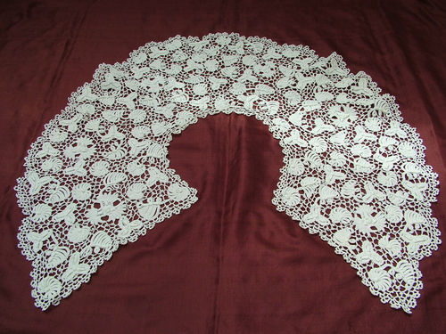 Comments: A deep shawl collar of Irish Crochet. Note the picoted edges of the motifs, quite an elegant touch. Good raised work, and the picots on the brides appear to be chainstitch rings. Looks a little bit dry, but that just might be the photos. Overall very good condition, very minor defects.
