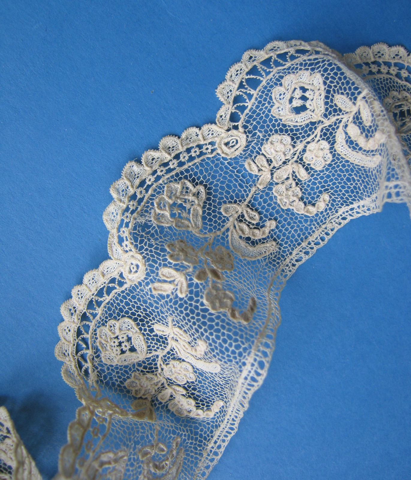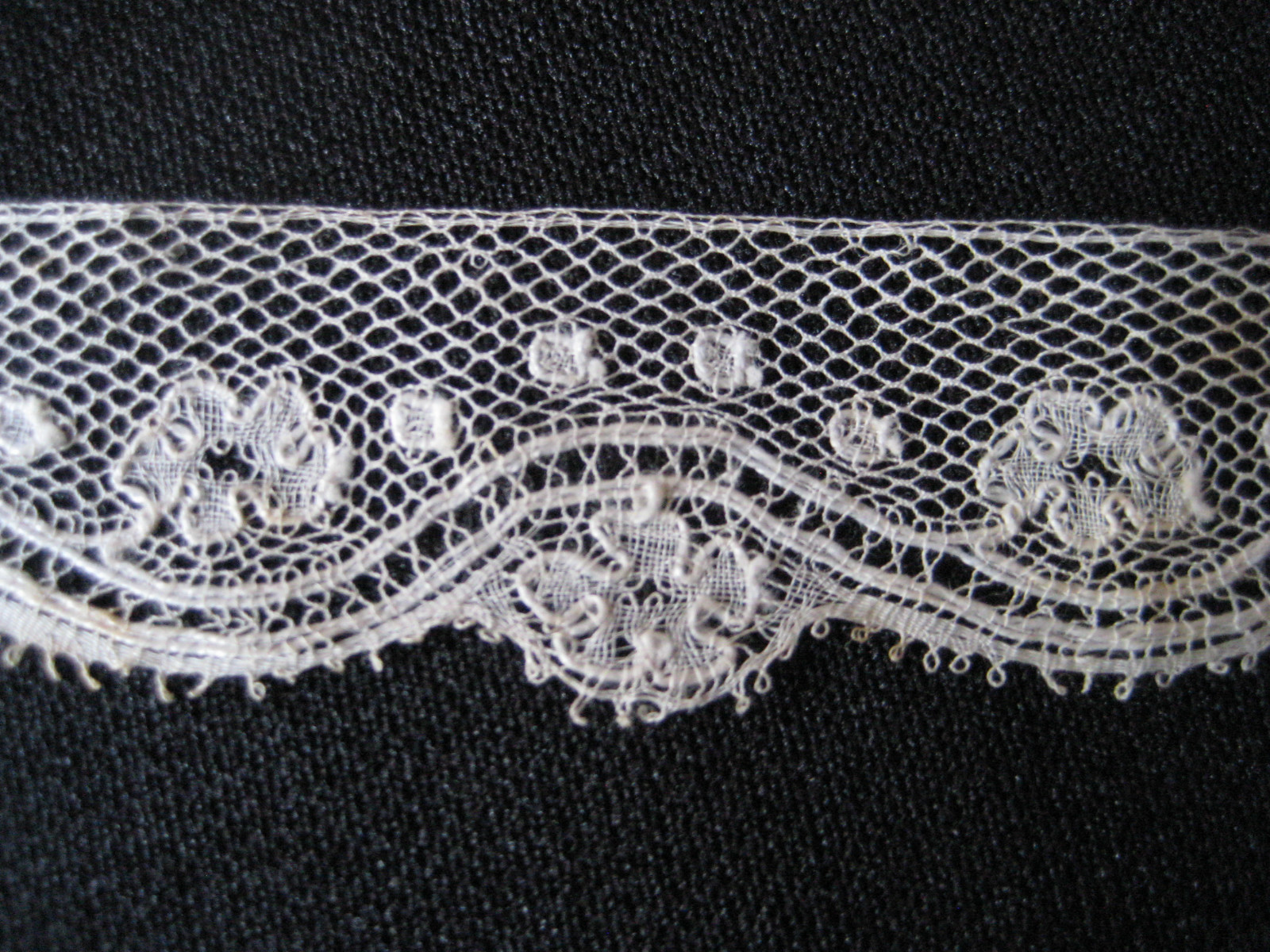 Comments: A narrow scalloped border of Alençon with réseau fin ground. It has the more open toilé of the later 19th century, and note the firm horsehair through the picots on the edge. Rather subdued on fillings, but it’s a small piece and they are nicely done. The looks intact, but with a few repairs or pulls. One join in the center. Overall good condition.