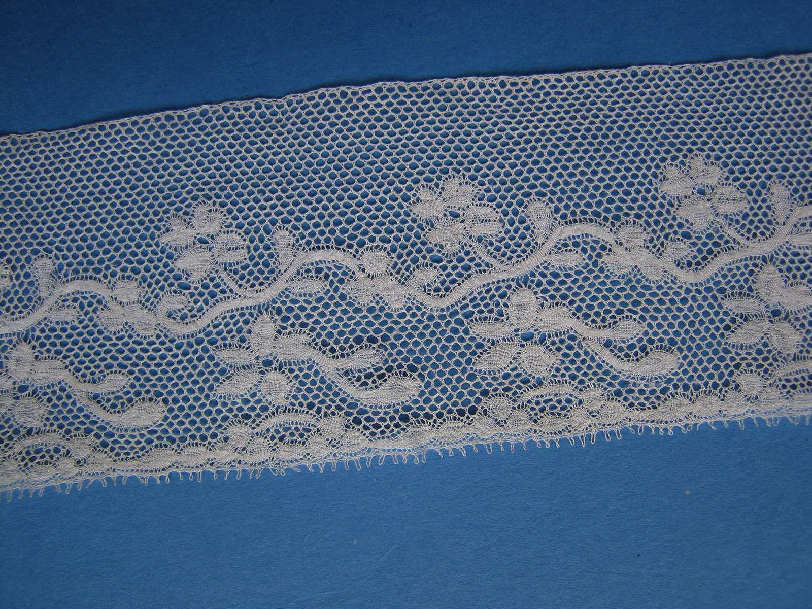 Comments: Later 18th century Valenciennes, round hole ground. The design looks a little more toward the 19th c, straight edge and no esprits in the ground. A well done piece, finer than it looks in the photos. Seller cites a faint stain, otherwise very good condition.