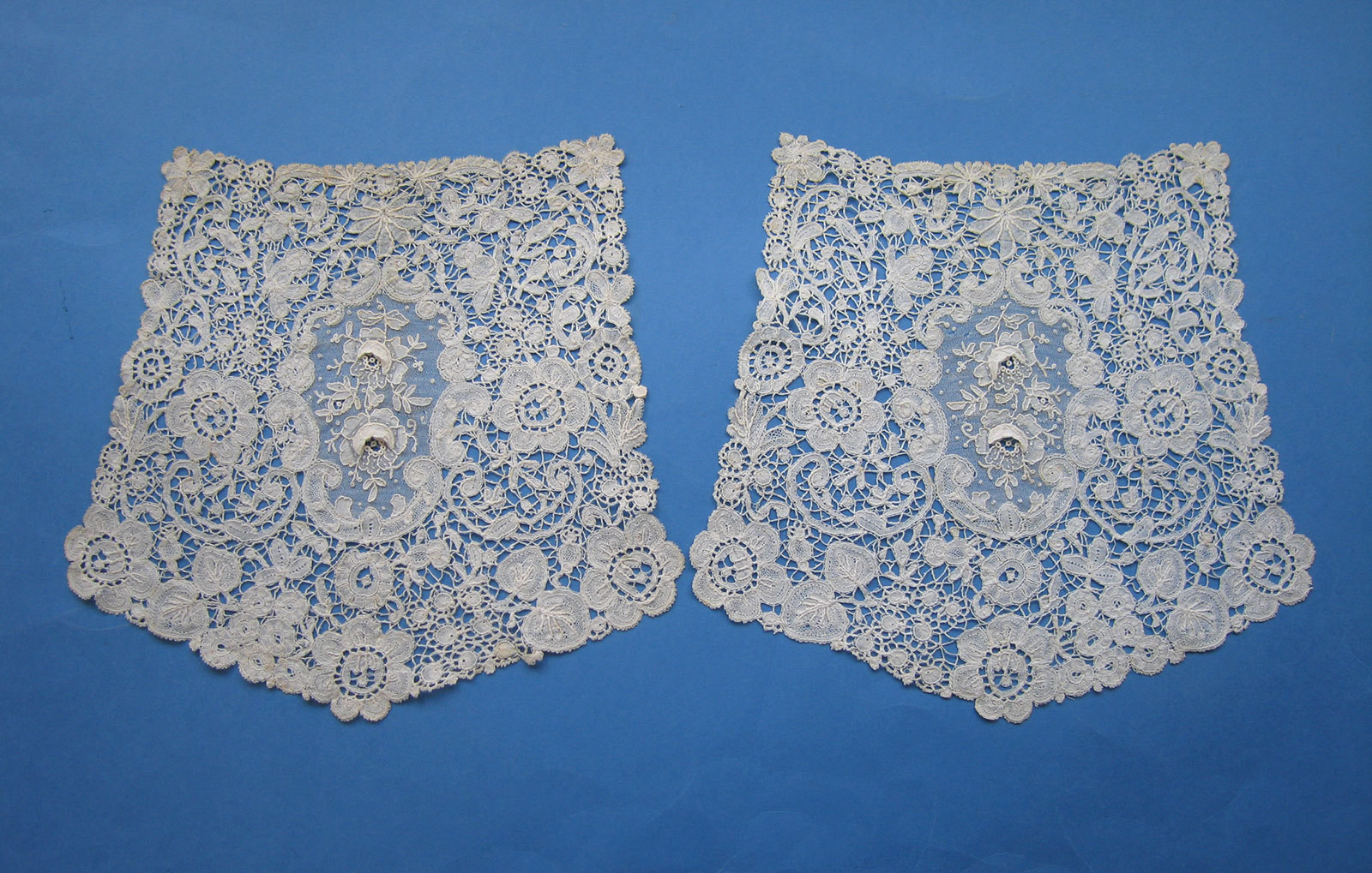Comments: Brussels Duchesse – seller is probably right and they are end pieces to a narrow scarf. Raised rose petals in the Point de Gaze inserts. Good, well balanced design, nicely worked. Appears in very good condition, just a few pinholes in the needlelace mesh.