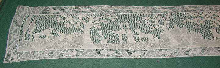 Comments: A pictorial bobbinlace panel, quite wide and narrow. Not sure where this could have originated. Figural bobbinlace is often associated with Northern Italy, however that is basically pieced work and this is continuous. It shows the fable of the fox and the stork which appeared in La Fontaine, however was a much earlier story. It has a kind of ring net ground, unusual. I’m wondering if this isn’t a Belgian piece, early 20th c. Seller says it has been soaked and dried, with a few tiny breaks. Basically good condition.