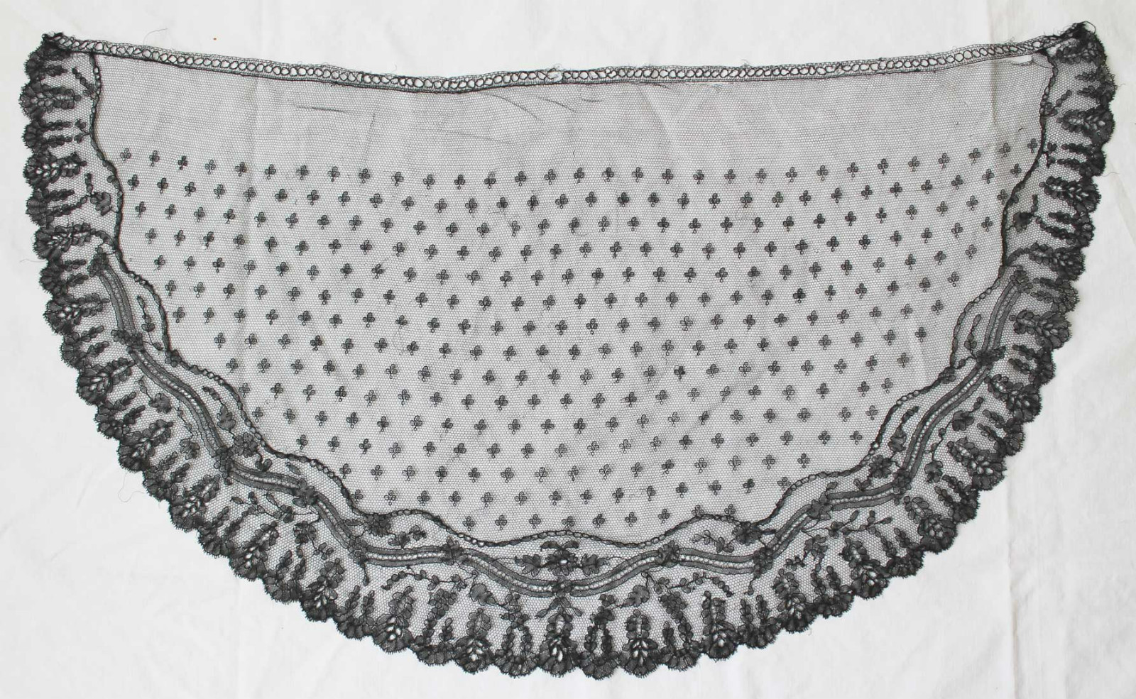 Comments: A semi-circular Chantilly bonnet veil. The edge at the top has holes to thread a ribbon through; t his would be gathered around a hat brim. Lots of esprits in the main ground, narrow border outside. A few holes near the top edge, especially at the right side. Basically good condition.