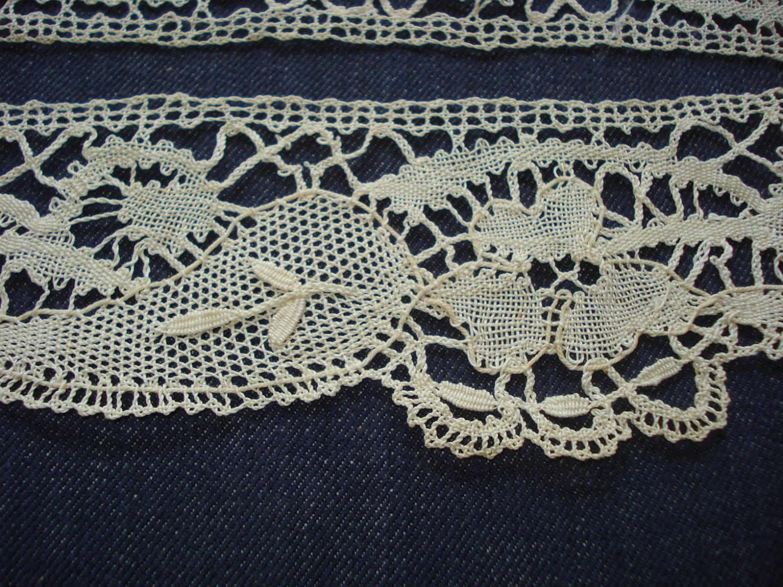 Comments: Basically fragments of early 18th c Valenciennes, 5-hole ground with some snowflake fillings. Good delineation of the design using only clothwork and some halfstitch – one of my favorite laces. Condition is short of good, many holes, but excellent study pieces.