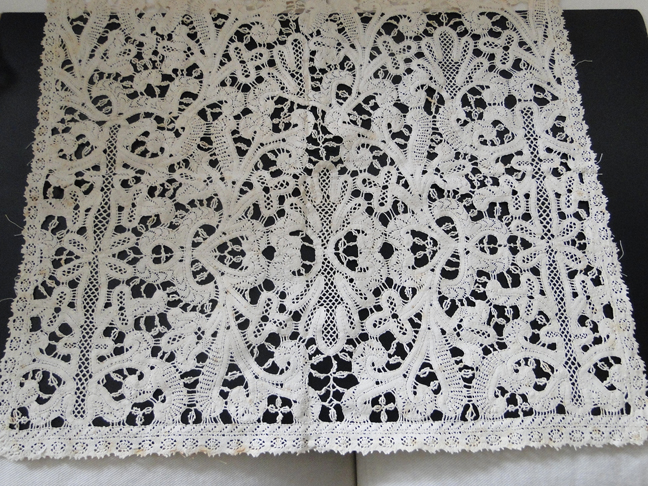 Comments: A very striking design – really wish there were more of it. It has the look of pieces from the Sessa brothers books of the mid 16th c, but more advanced. The woven leaves are a feature of Genoese lace, however the tape-like structure deviates from the more plaited design usually seen in Genoese bobbinlace. Milanese of the early 17th c did occasional include a little leaf work. It bears some resemblance to plate 121 in Leavey’s “Lace, a History”, and she labels this Milanese from 1620-40. Looks in very good condition considering the age.