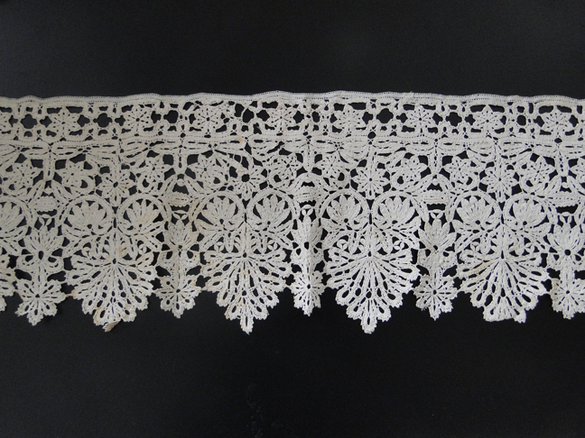 Comments: One of those indeterminate guipures, call it Cluny and move on? Not really, seller says it is a Craponne piece, which is not inconceivable. Nicely done, and a very long length. Appears in very good condition.