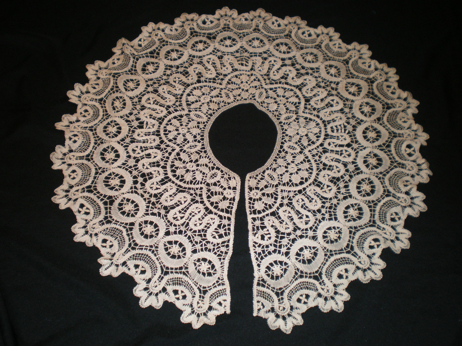 Comments: A deep Maltese shawl collar. Good guipure on the inner section with large, well worked Maltese crosses. Nice sun design on the inner portion, and small flower roundels on the outer edge. The points at the opening edge look a little strange, almost cut off. Maltese was almost always pieced together, so it might just be a finishing choice. Seller notes that some loose spots, and one split in the back. Overall good condition.