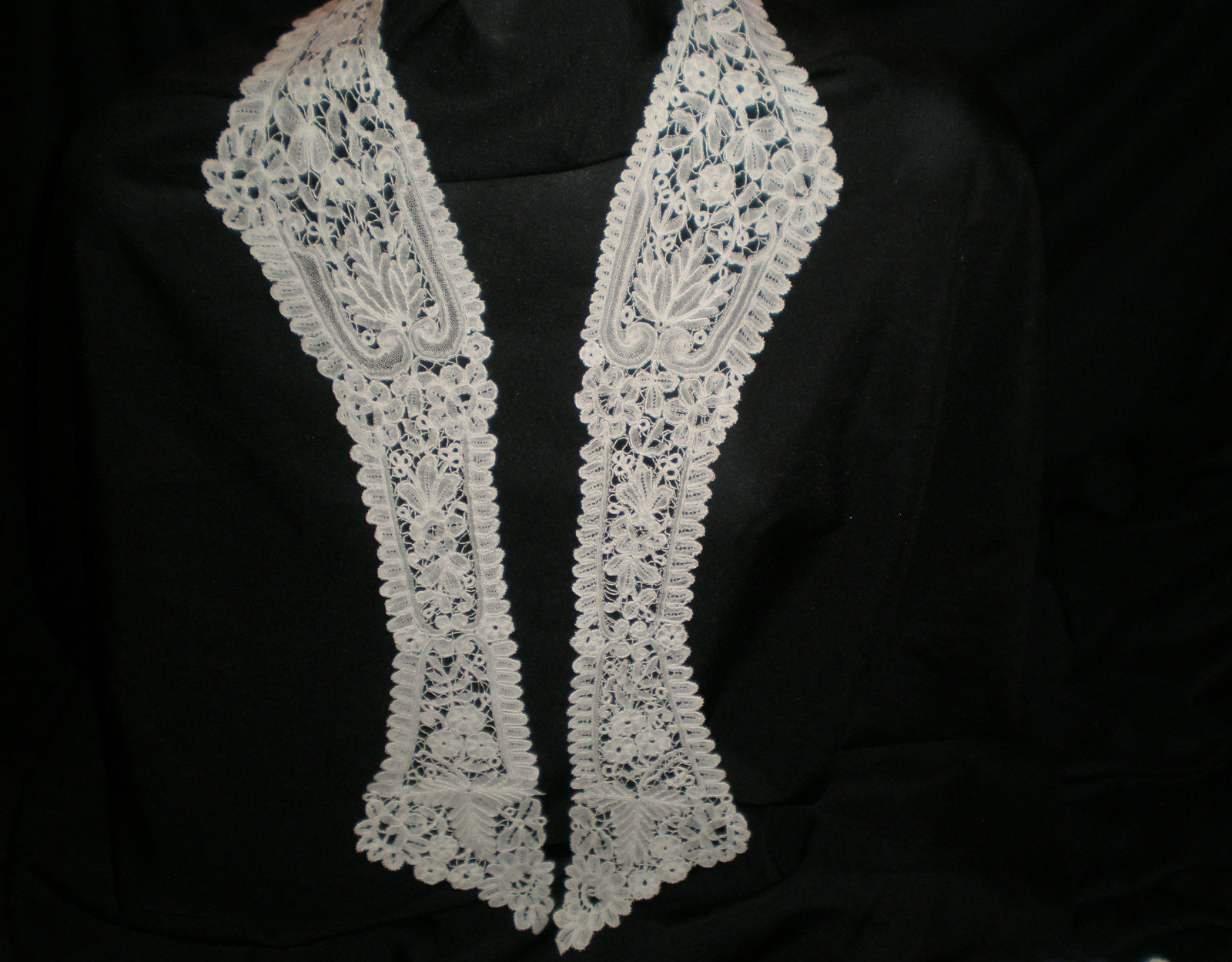 Comments: A lappet collar of Duchesse, on the Bruges side in design. No needlelace that I can see. A good middle market product with a typical design of flowers and trefoil leaves. Looks in very good condition from the photos.