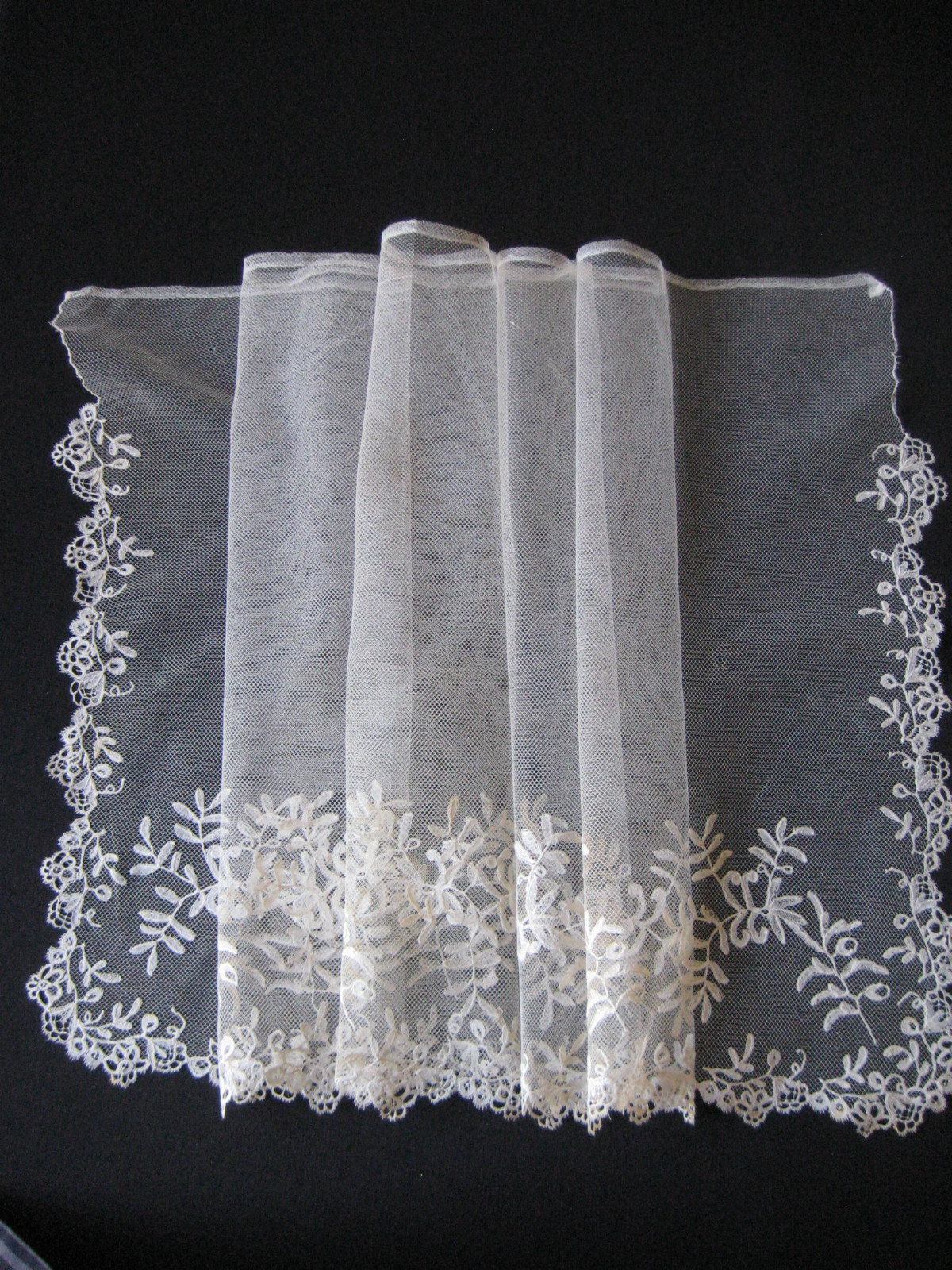 Comments: A bonnet veil of Brussels bobbinlace application on machine net. A deeper border of flower sprays at the bottom, and smaller flowers along the sides almost to the top. No esprits in the ground. Seller cites several repairs to the net, basically good condition overall.