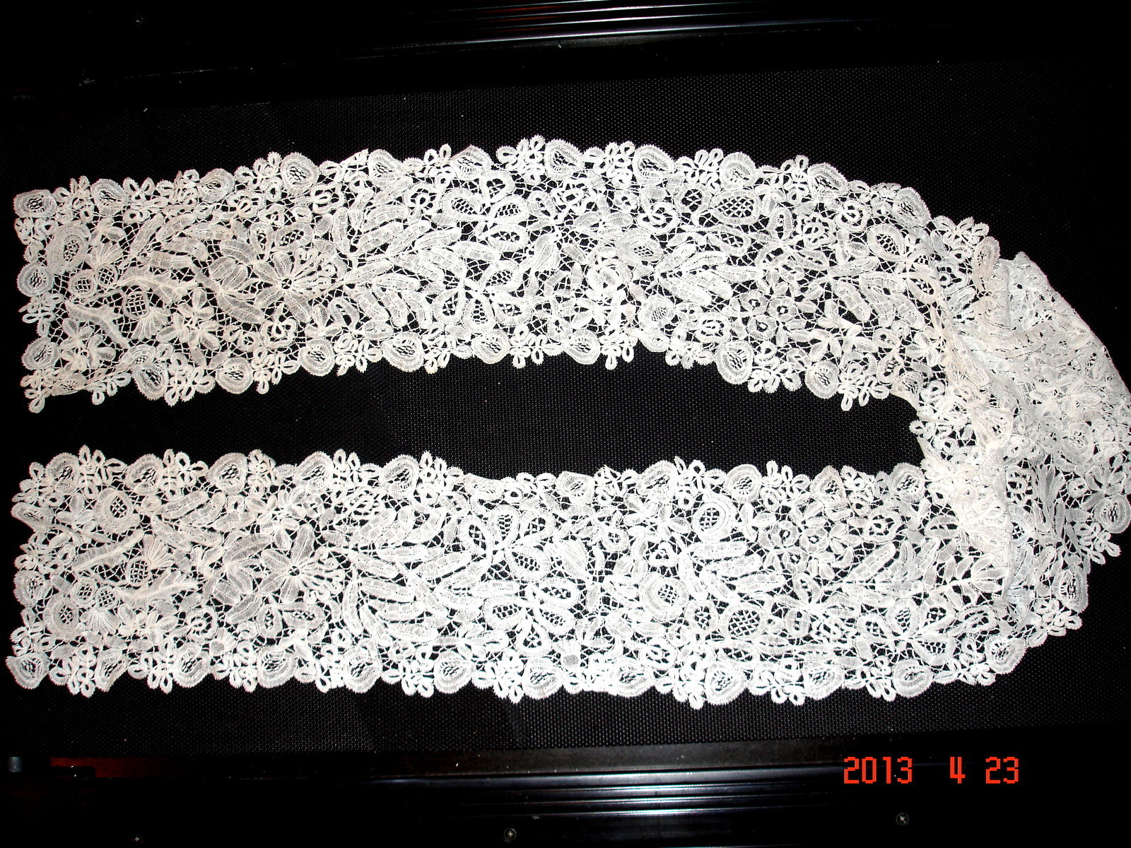 Comments: A long, narrow lappet scarf of Duchesse. It makes quite effective use of basically 2 motifs – leaves with raised work, and small flowers. Definitely a different design for this lace. One break toward the center, a little stained, basically good condition.