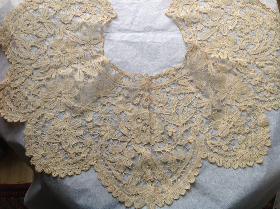 Comments: A shawl collar of one of those intdeterminate guipures, perhaps French. But could be German or Easter European – many possibilities. Thread looks linen to me, but that’s just a guess. The design looks a little ‘layered’ to me, there’s a lot going on. It’s an unusual and rather dramatic piece, looks in very good condition from the photos.