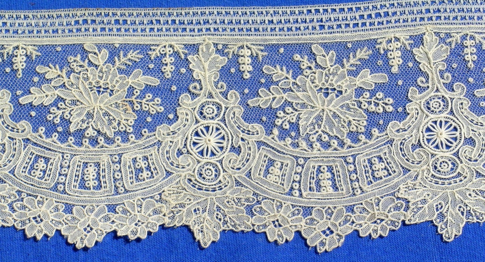 Comments: A fine Flemish bobbinlace, I’d put it around 1740. The motifs are very crisp and well executed. Note the snowflake fillings. Very good condition, unusual to find something this good, in all 3 areas of importance to collectors – design, technique, condition. My only gripe is the join ~1/3rd of the way from one end.