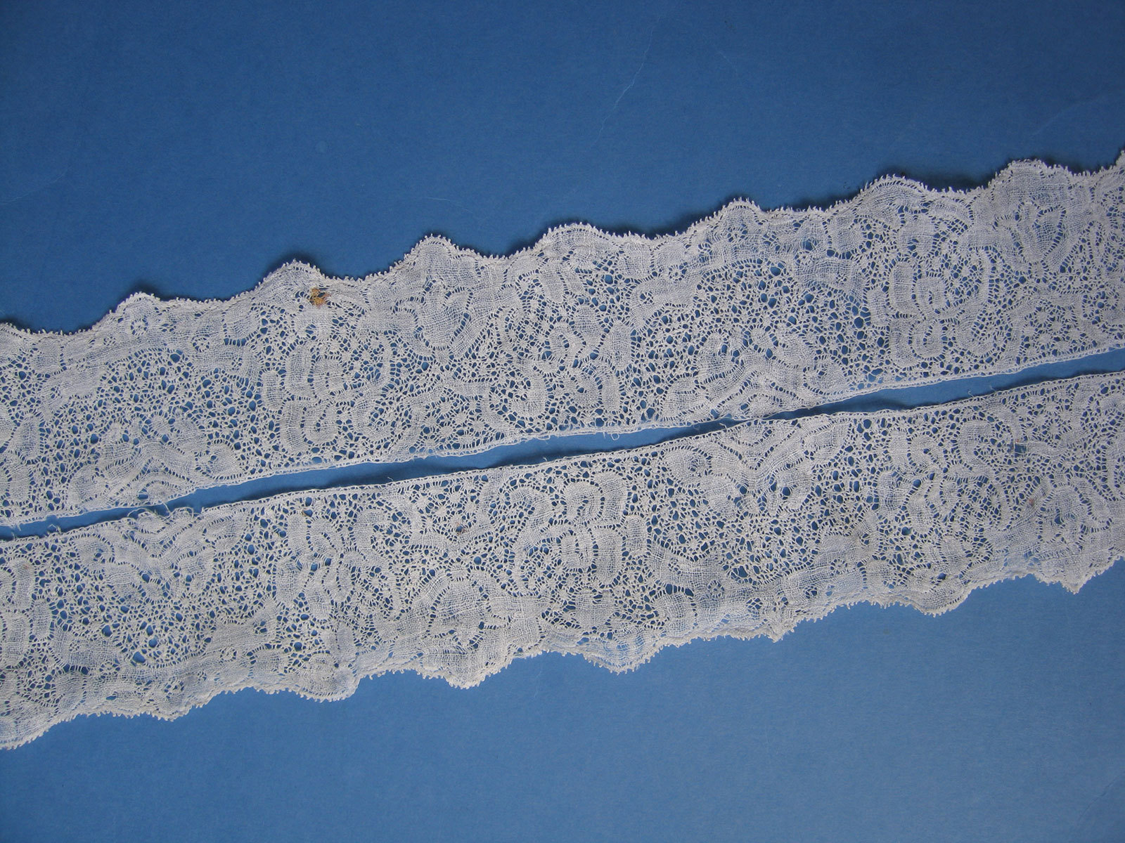 Comments: The condition of this Valenciennes border is on the lower side of good (3 joins, fraying and holes, breaks on the footside). But it is a nice example of ~1730-40 design Valenciennes. Much like the Argentan industry discussed above, Binche was small compared to Valenciennes at this time, and we really don’t know much about what it produced. This example has two types of ‘snowflake’ meshes, the ones with the holes being the oeil de perdrix (partridge eye) variation. The general design reminds me a lot of contemporary Mechlin.