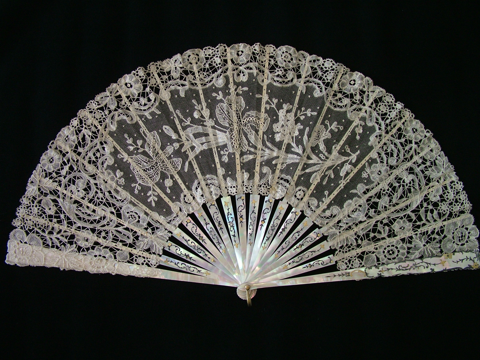 Comments: A Brussels Duchesse fan with elaborate Mother of Pearl/Abalone sticks. Well, actually the center part consists of both needle and bobbin applique on machine net, so that takes it a bit away from the Duchesse standard. The applique is nicely done in a naturalistic design of needlelace irises, all else in bobbinlace. I don’t see any damage to the tulle, which is unusual. This part is nicely set off by the surrounding bobbinlace. The piece has a nice presence, and the highly decorated sticks endorse a higher end quality. The Seller says 6 of the sticks are damaged, see listing for a complete rundown. The lace is in very good condition.