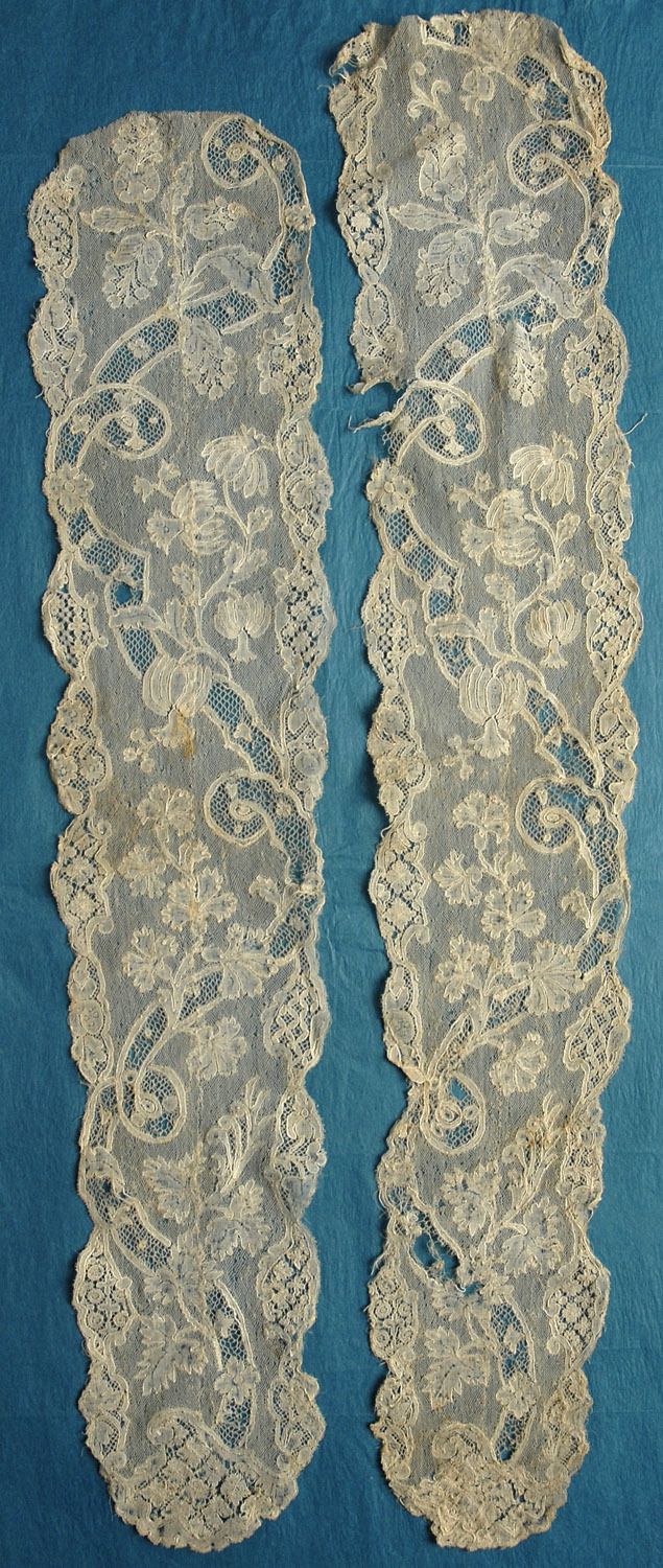 Comments: Ex. coll. Pat Earnshaw. Two mid 18th c Mechlin lappets which unfortunately are in poor condition. But the lace is delicate, good design and beautifully worked.