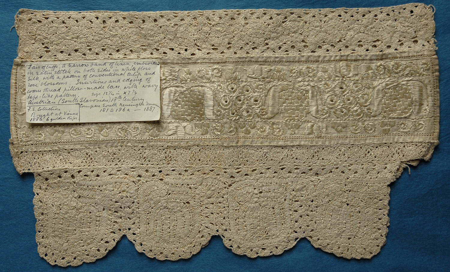 Comments: Ex. coll. Pat Earnshaw. According to the attached note: “Pair of cuffs. A narrow band of linen, embroidered in satin stitch on both sides in white flors silk, with a pattern of conventional tulip and rose blossoms. Insertions and edging of coarse thread pillow-made lace with wavy tape-like pattern. size 12-1/4 in x 17 1/4. Austrian (South Slavonian) 18th century. Compare South Kensington Museum 181 to 186a 1887. (P E ?) Collection Bought at Vienna 1886 6 guilden each”.