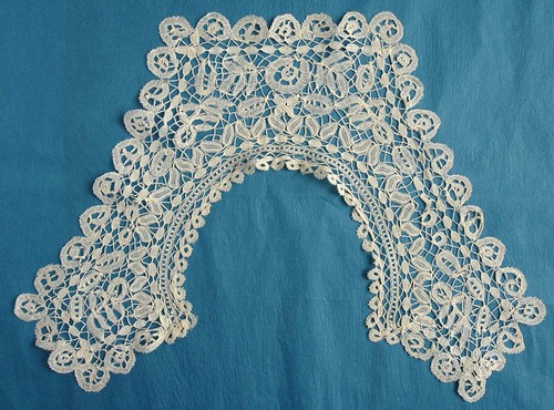 Comments: A collar or dress front of Honiton guipure. Snails/slugs esthetic. It actually has some machine made tape just inside the neckline and just inside the outer border of flowers. You see this occasionally and it obviously speeds up the work. The handmade motifs look a little rushed. But the overall condition of this piece looks very good. A nice combination example of Honiton and machine tape.