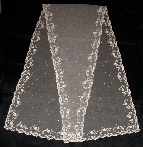 Comments: A rectangular scarf of Brussels bobbinlace applique on machine tulle. A fairly simple design of a simple rose repeat, and note the extensive esprits in the ground. The condition appears very good, in fact exceptionally good. This is very unusual.