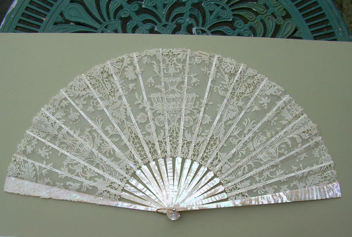 http://tinyurl.com/ns7nzp4 Antique Victorian Large Mother of Pearl Brussels Point De Gaze Fan.
