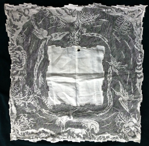Comments: It’s a little big for a handkerchief, but a little small for a table linen. Filet embroidery, and the design is an interesting, naturalistic design of storks, different on all sides. Good condition despite the unfortunate small hole in the center cloth.