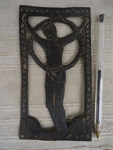 Comments: Most French pliors have fairly standard chip carved designs, sometimes with openwork. This is a dated (1971) example with initials, of a crucifixion scene. It is different front and back. The warpage and patina on this piece look good, but still buyer beware. Looks in very good condition, no chips or cracks that I can see.