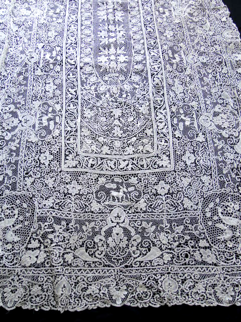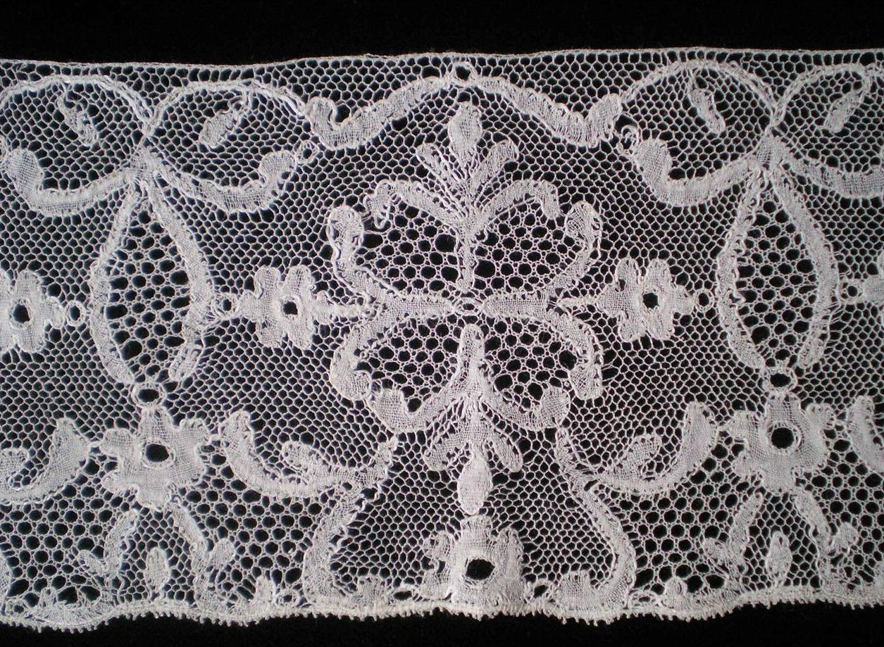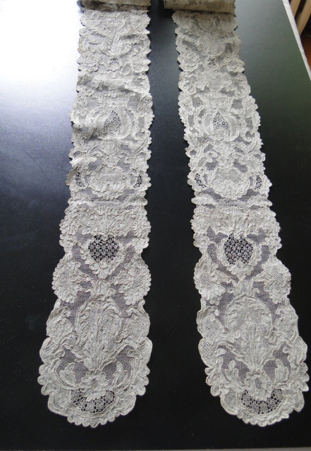 Comments: I definitely agree with the seller in that the ‘museum’ made a mistake in de-accessioning these – but all the better for collectors. I also think they tend toward Alençon with the réseau fin, and the well-done ‘mode’ fillings. Yet the clothwork itself has a kind of fine Belgian needlelace feel. Perhaps this is one of those examples of work done in Flanders and finished in France. The condition is absolutely exceptional – occasional pinhole is trivial. It will be a long time before something of this quality hits the market again.