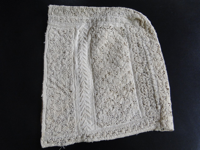 Comments: Wow. Hmmm. A cap with reticella panels, very dense. It sort of resembles patterns found in Giovanni Ostaus, “La verra perfettionne del disegno”, Venice 1557, but not exactly. That has some of the same diagonal bandwork and circular motifs, but also includes some picot work not seen here. So one might call this Italian late 16th c. Or you can give up and say we really don’t know how to date pieces that might be this early, which is very true. Flanders did similar work, but much lighter in texture. The coif shape is not inconsistent with the period, and this might have been only part of a more formal headdress. The condition looks very good, especially if it really is this old. Maybe a little too good.