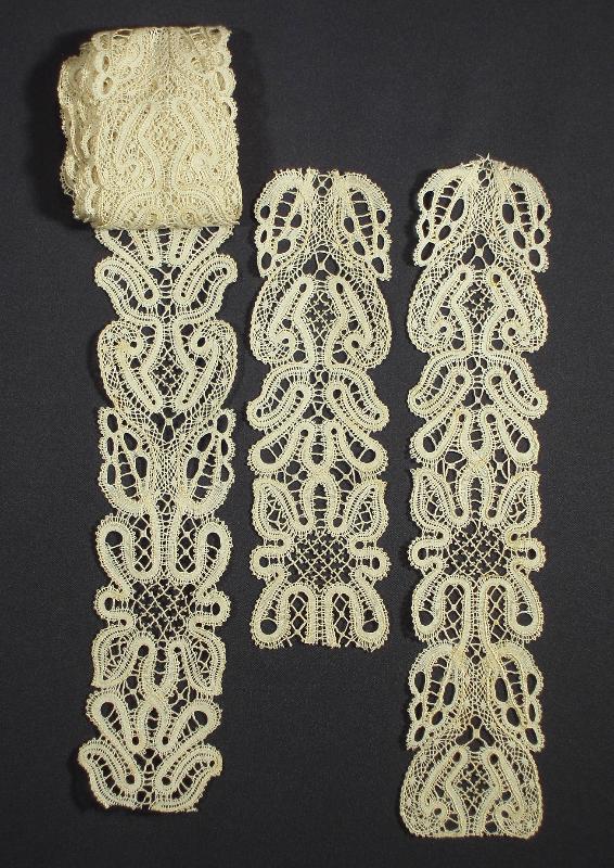 Comments: Two short and one long length of the same insertion. This is a tape lace with some very interesting treatment of the tape itself. Gives it a very bold appearance. I think it is probably an Eastern European lace, but where I’m really not sure. I don’t think Russia because of the lack of a gimp. Hungary isn’t a bad guess. Perhaps readers have a suggestion? A few age spots, but overall very good condition.