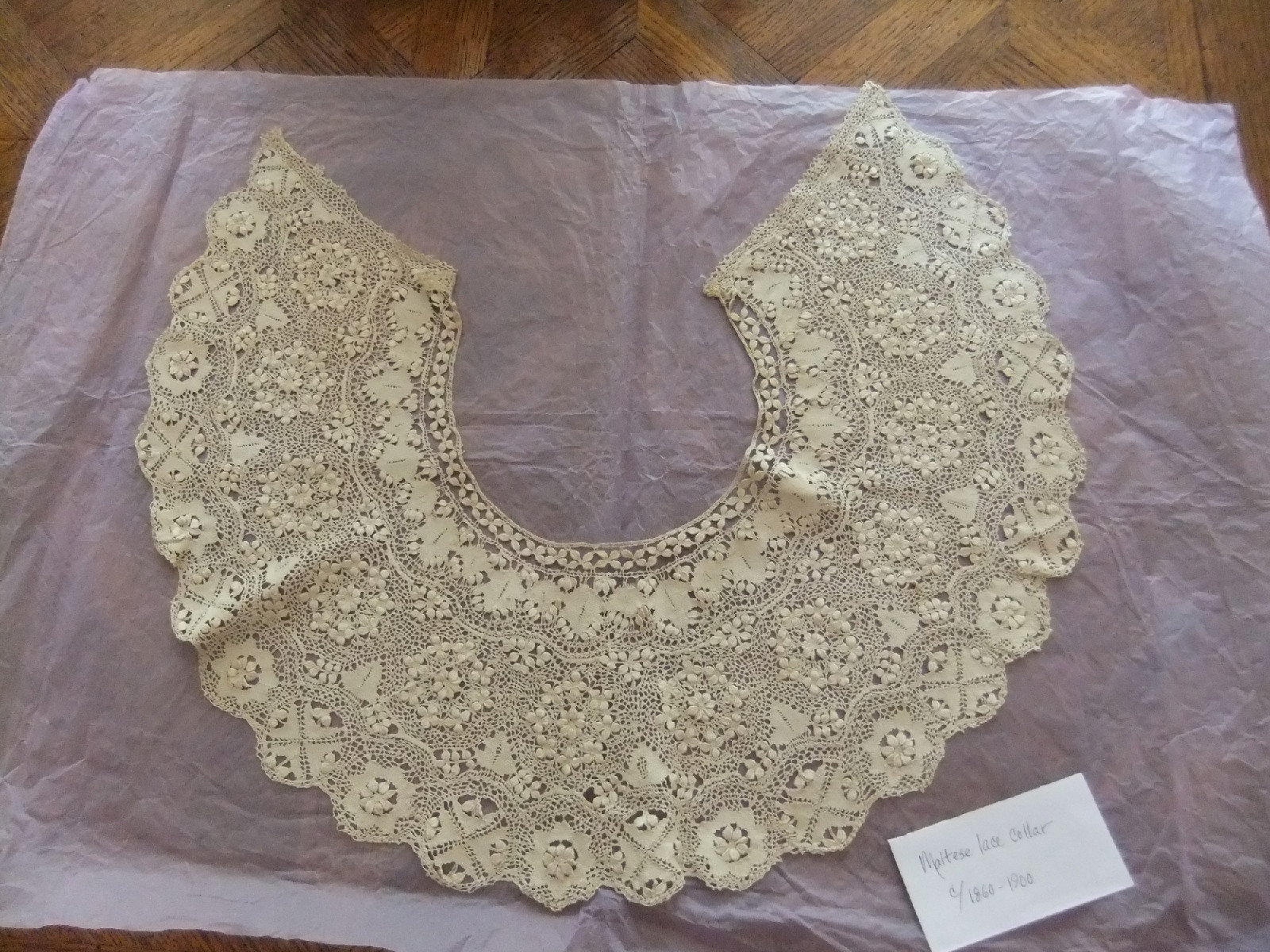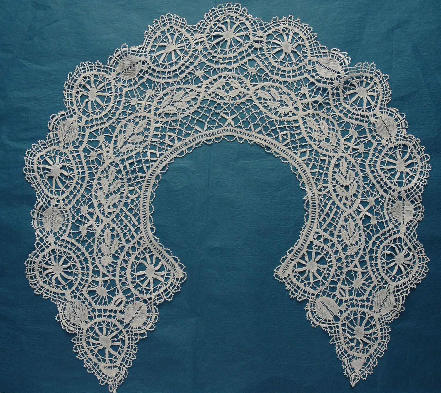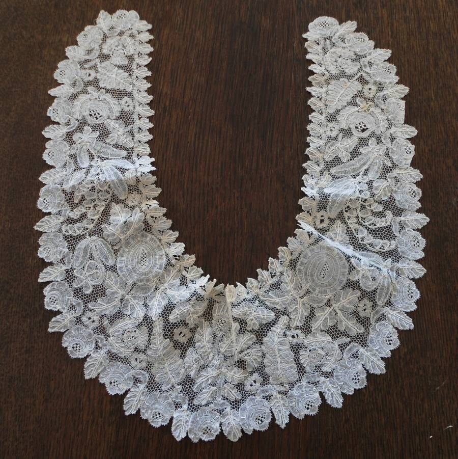 Comments: A wide Beds collar, where the work on the guipure leaves enclosed in crossed trails is a feature of this lace. Looks in very good condition.
