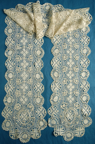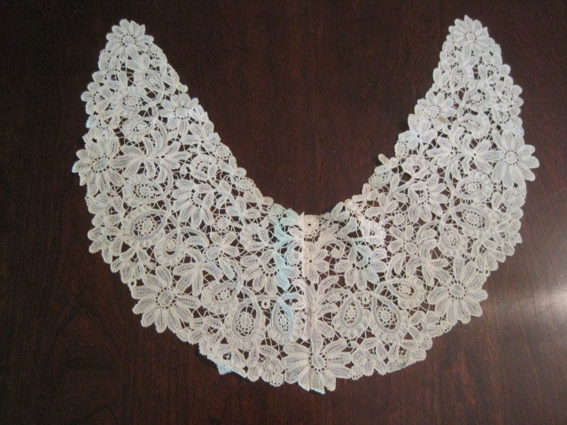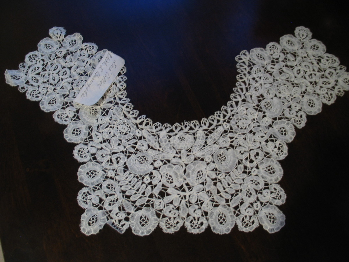 Comments: A collar of Honiton Point lace, meaning bobbin-made motifs with a needle-made ground. Motifs are nicely done, a little snails/slugs, but definitely breaking out of that mode. The design is quite dense, fairly symmetric, but a little haphazard. Actually rather charming. Looks in very good condition.