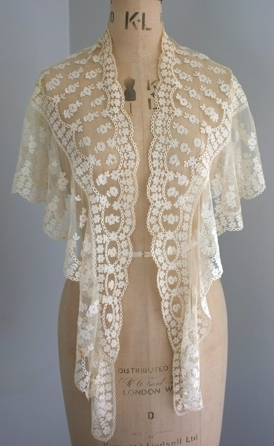 Comments: A 2-part shawl of muslin applique on machine net, almost a mantilla form. The center triangular piece is edged with a deep flounce. The photos aren’t close enough to tell how the applique was done, tambour or overcast, so it’s hard to attribute an origin. I’m guessing Belgium. Seller cites 2 tiny repairs and slight back neck edge yellowing. It’s an impressive looking piece in very good condition.