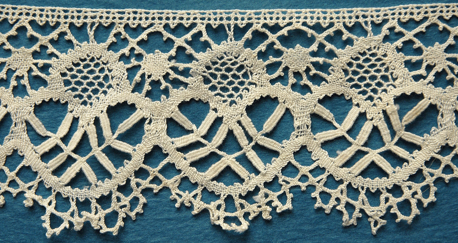 Comments: A solid-looking plaited border, probably Beds. The thread seems a little thicker relative to the design than usually seen, and the ‘point ground’ fillings are unusual. Looks in very good condition.