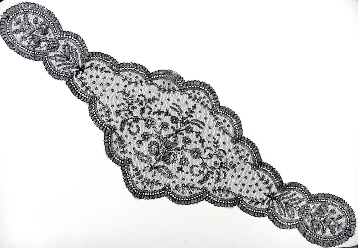 Comments: A Chantilly fallcap with diamond shaped headpiece and lappet ends. Very black in color with simple honeycomb pieces, probably a Belgian piece. This one looks in very good condition. Smaller shaped Chantilly pieces don’t come up that often.