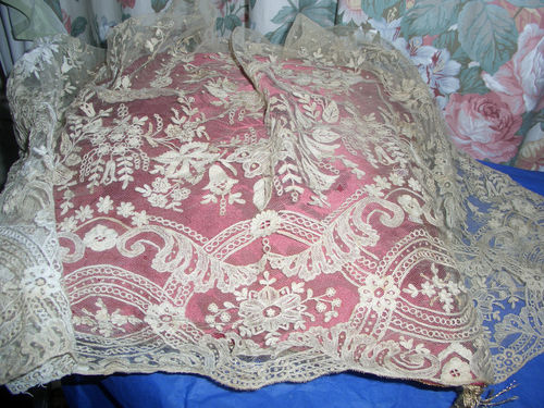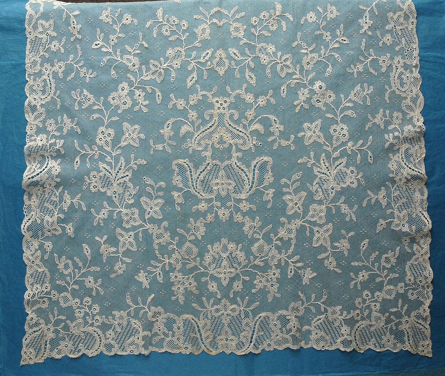 Comments: I agree with the seller, this looks like a large square shawl cut approximately in half. Brussels Duchesse, combined needle and bobbinlace. A naturalistic design that fills the space well. Note the needlelace fillings in the bobbinlace flowers, as well as complete needlelace motifs standing alone. One not too well done repair to the net and a few pinholes. Basically good condition, just wish it hadn’t been cut down.