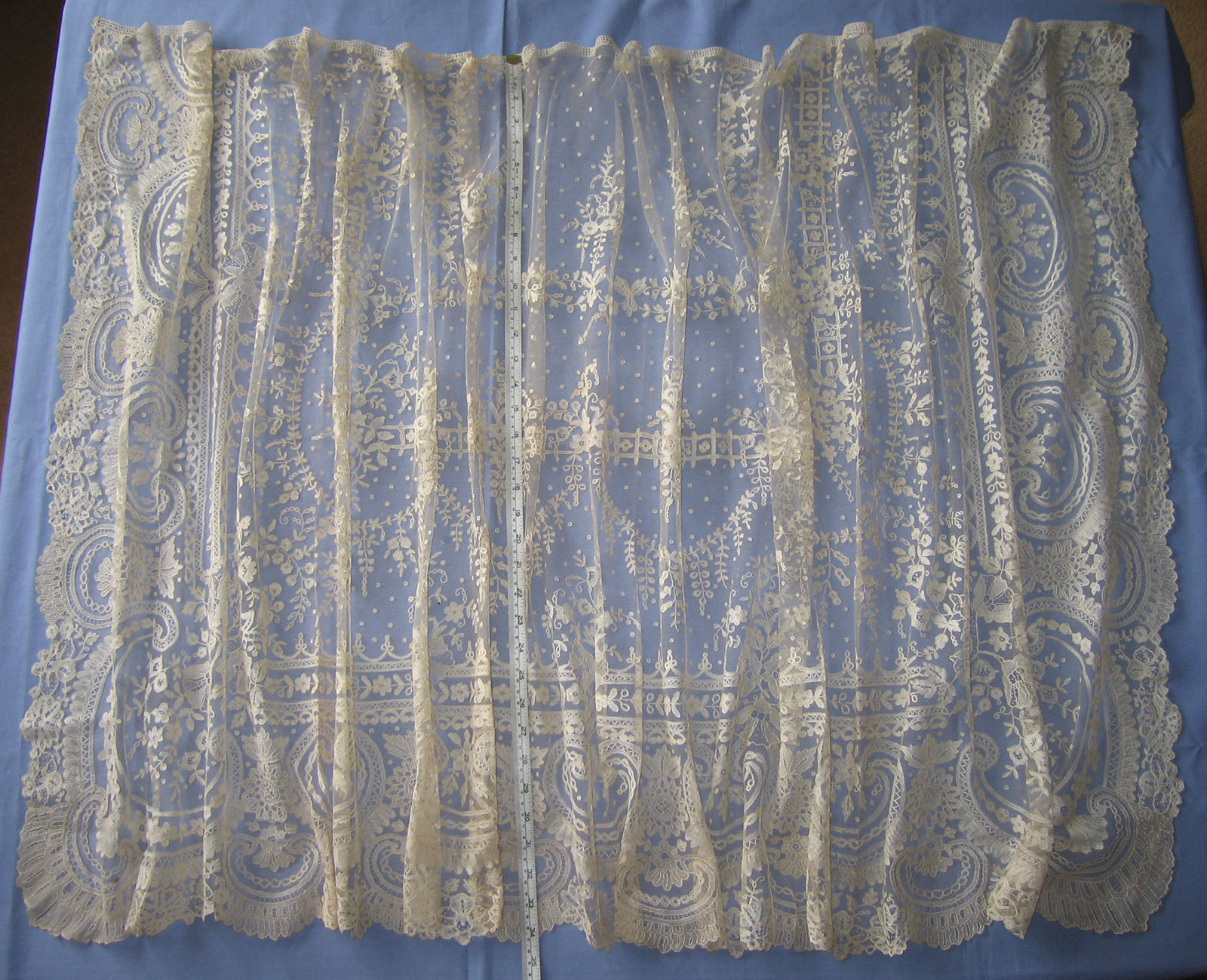 Comments: This embroidered net isn’t all that big, and I can’t tell from the photos if it is cut from something or original. The embroidery is quite elaborate and well done. I also can’t tell if it is tambour, but suspect that it is, which might indicate a Belgian origin. A few small holes in the net, basically good condition.