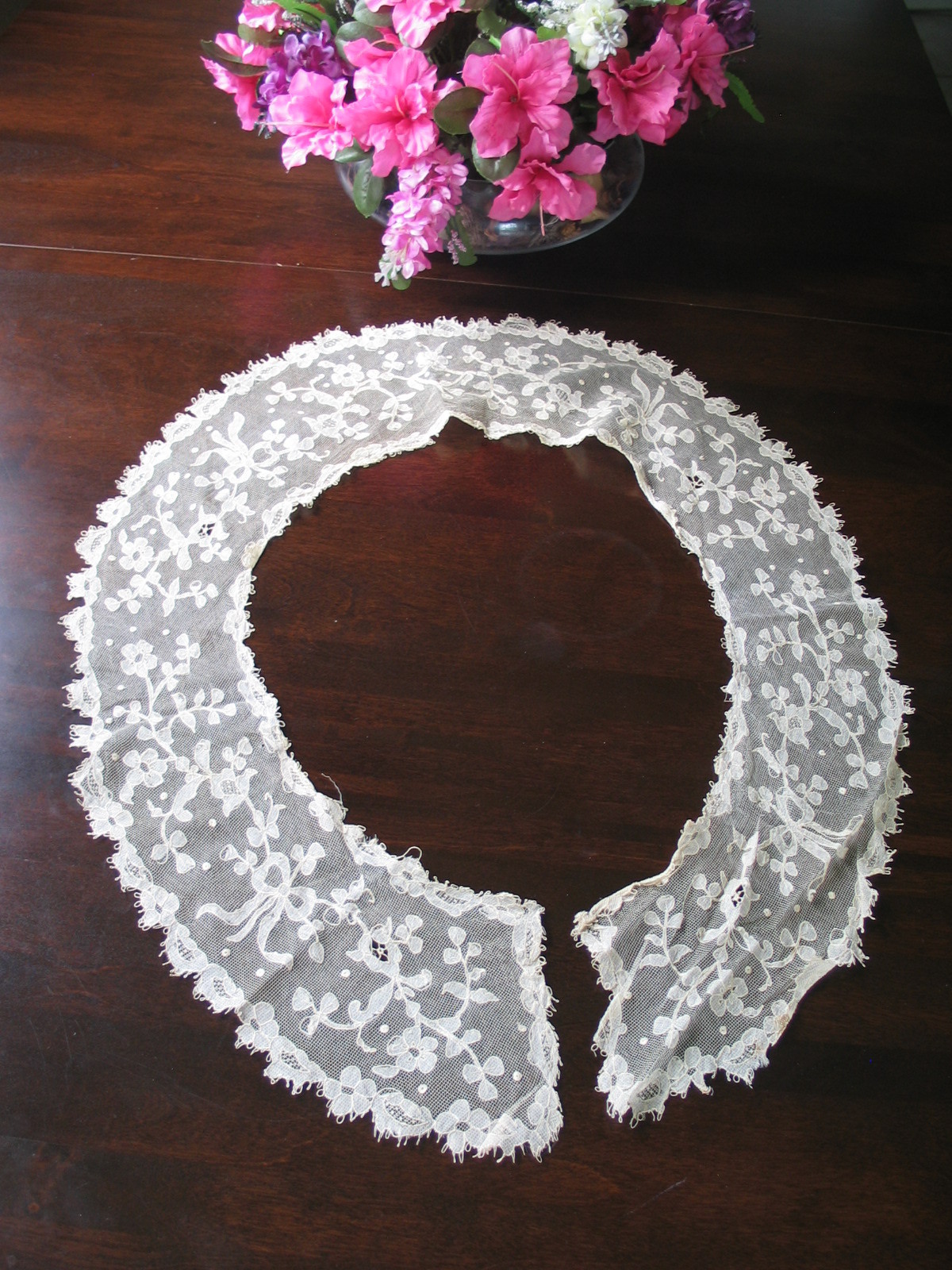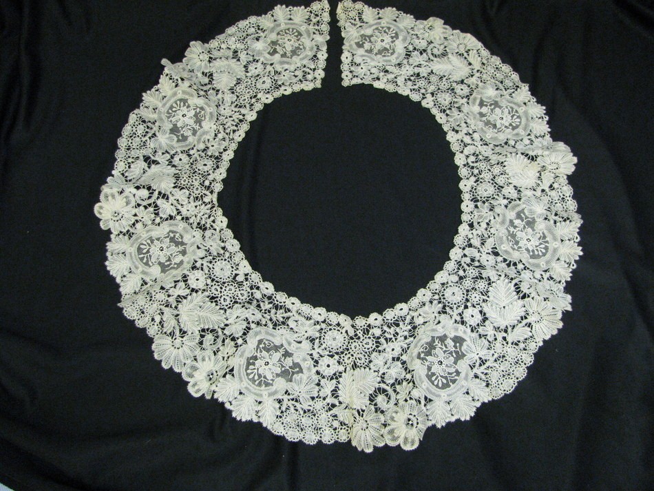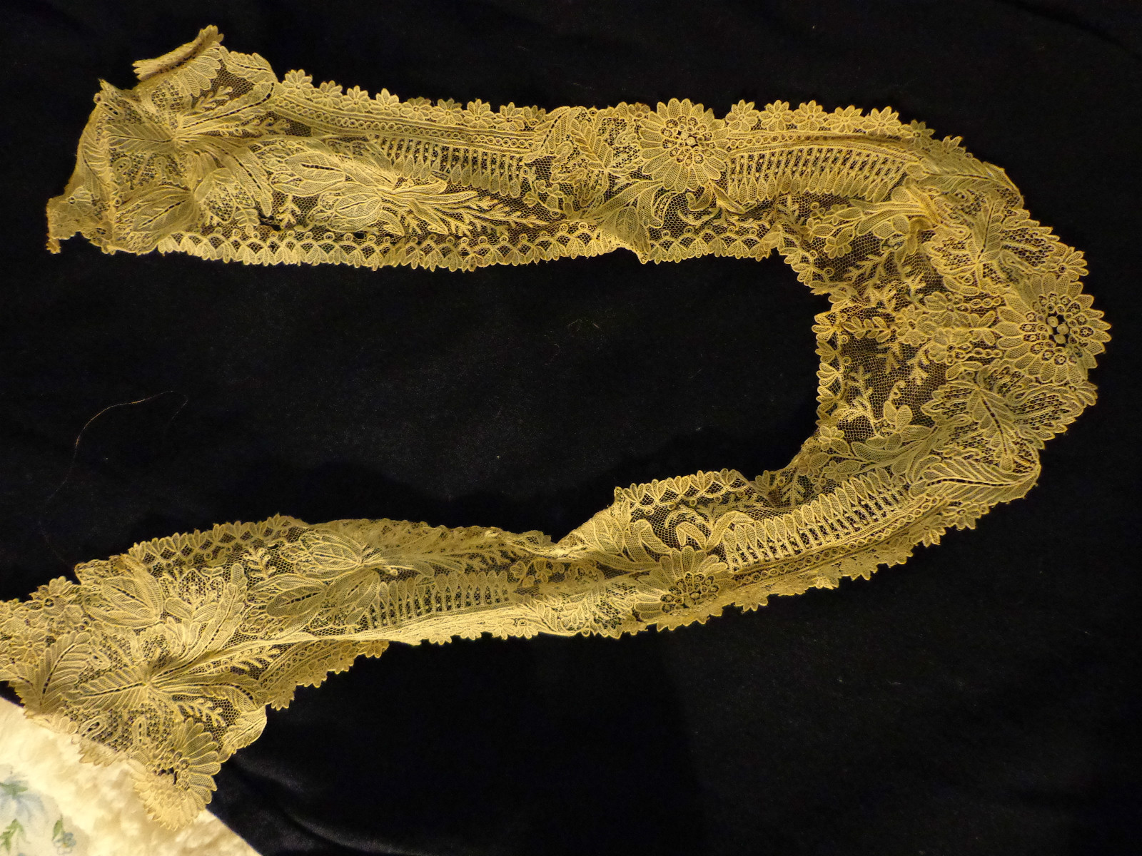 Comments: There are 2 collars in this lot, and I’m concentrating on the Point de Gaze longer one. This is a collar with long front points, no raised work, but it really doesn’t need any. Very dense, naturalistic design. There are a few small holes in the mesh, and I hope the real color isn’t orange-yellow. Overall good condition.