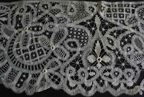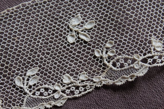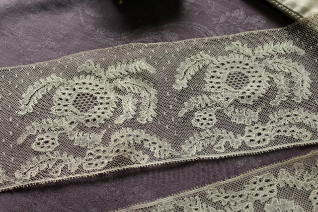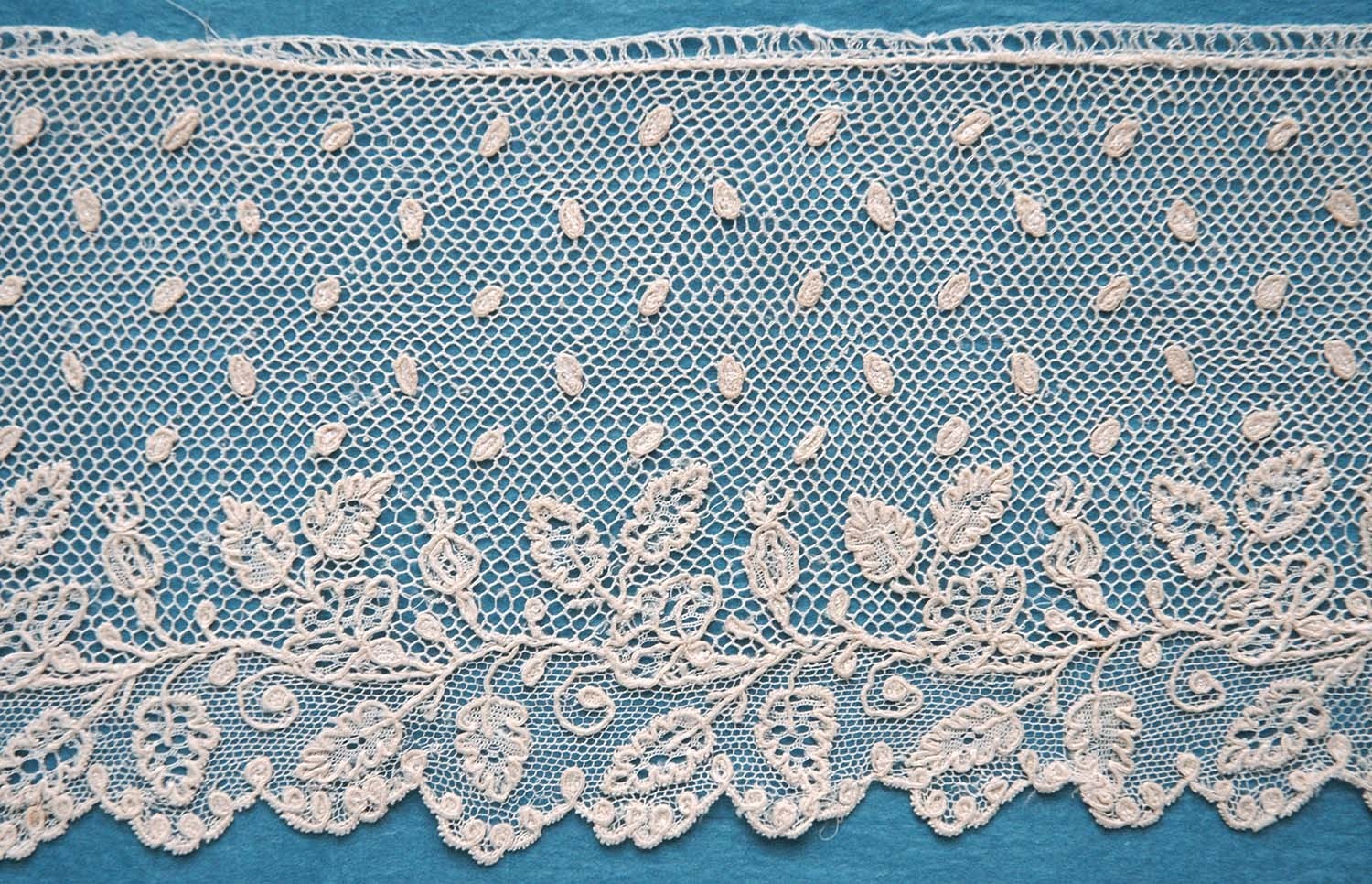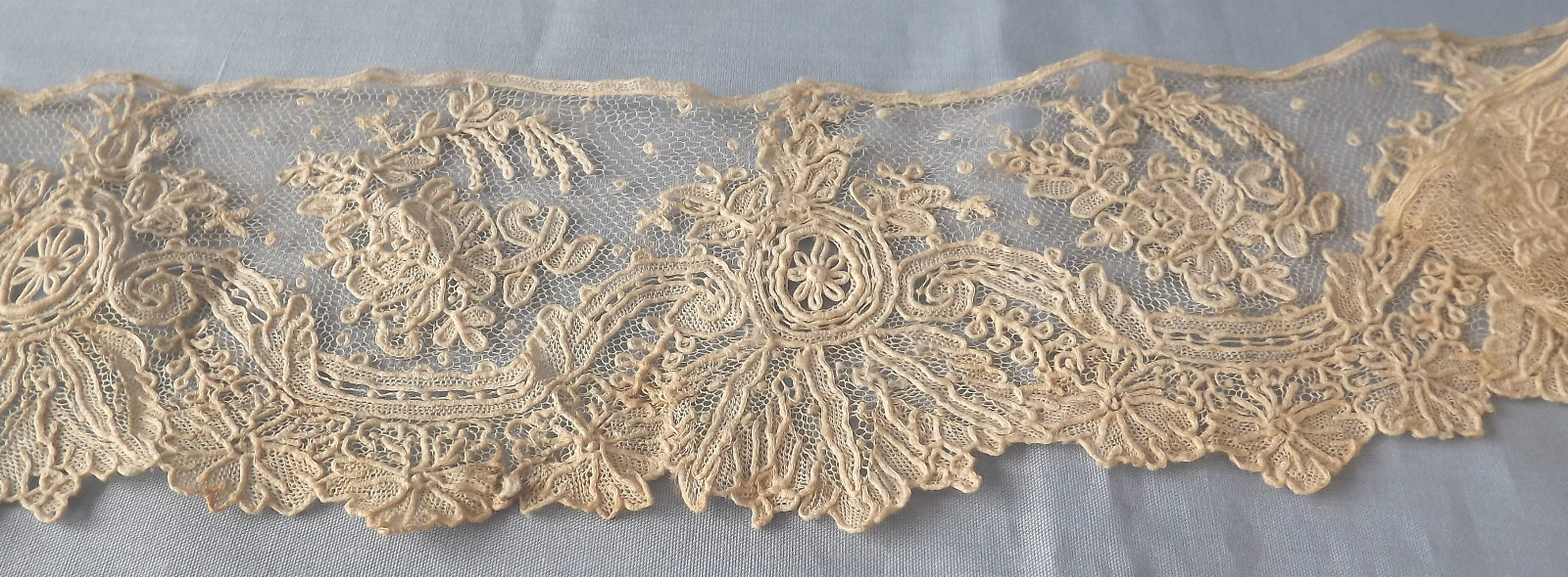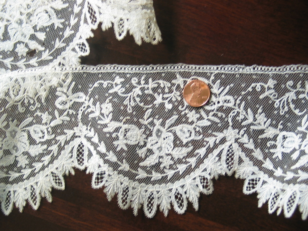 Comments: A Beveren point ground border, with typical straight edge and esprits in the ground. The dentate edges of the design, the gimp-bordered holes within the cloth stitch, and the honeycomb stitch fillings are characteristics of this lace. The condition looks very good from the photos. Note the tag from ‘La Cour Balave, Paris’ on one end, I don’t recognize this establishment. Google seems to indicate that it was a large group of buildings erected on the site of a former church. There might be more information on the other side of the tag.