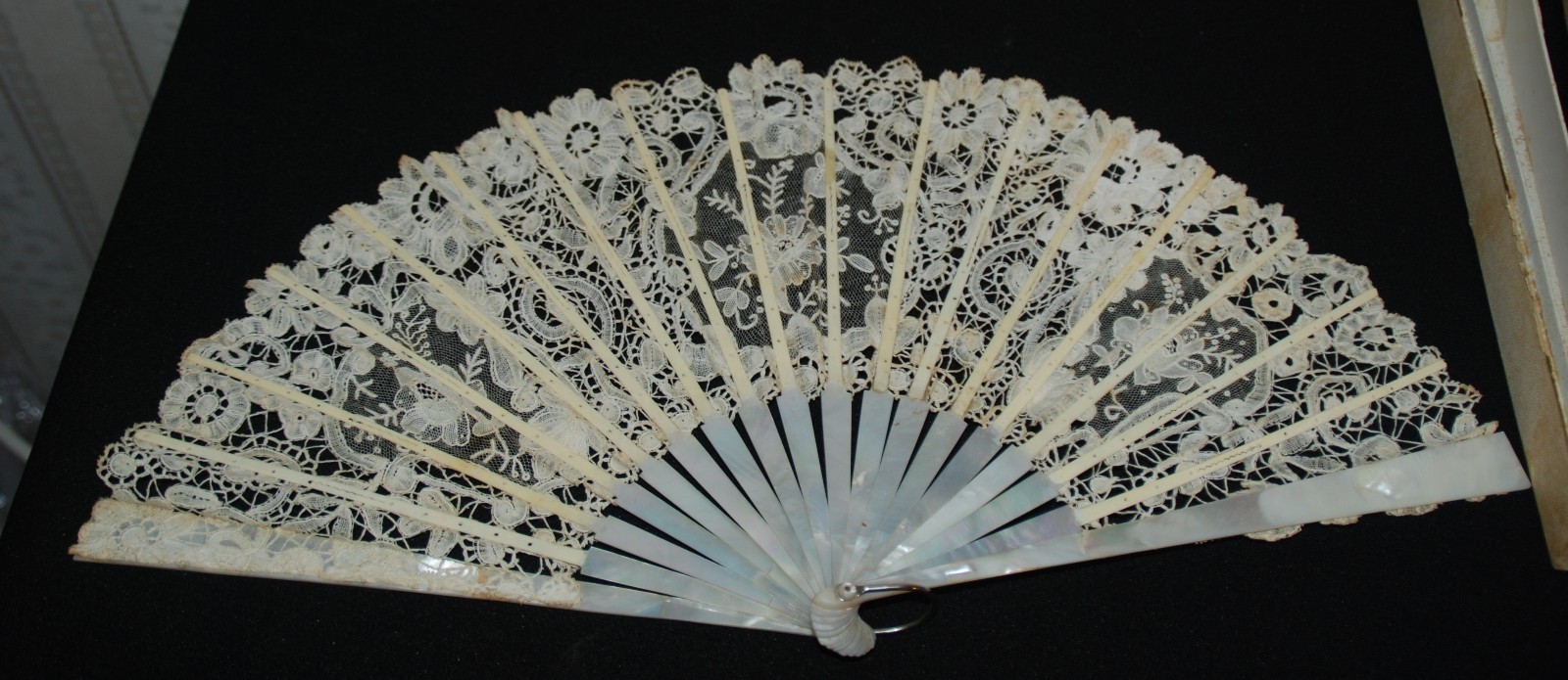 Comments: A fan of Brussels Duchesse with Mother of Pearl sticks and box. Three Point de Gaze inserts, I think the roses have raised petals, but a little hard to tell. Standard Duchesse motifs, although the design looks a little scattered. No condition notes, and it looks like there are some stains, so I’ll call it good from looking at the photos.