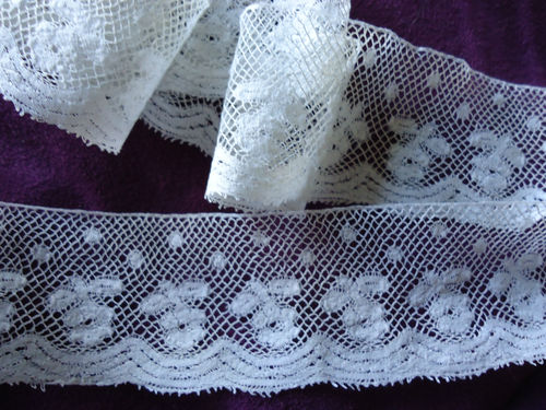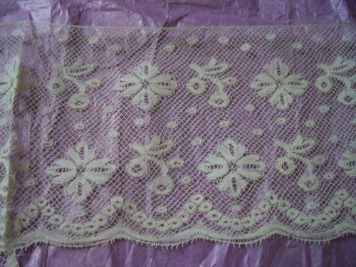 Comments: A narrow border of Valenciennes with the square-mesh 19th c plaited ground. The design is quite simple, probably later 19th c or early 20th c. This is a lace meant to edge nightclothes or bed linens. Looks in very good condition from the photos. So often lace like this was removed from some well-used piece, so it’s good to find one so intact.