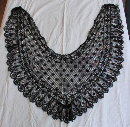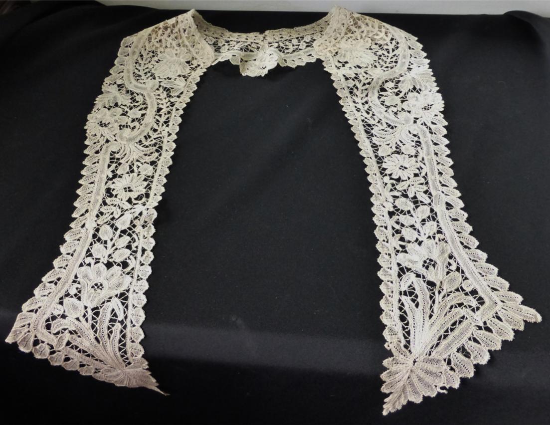 Comments: A bertha collar of Brussels Duchesse. Raised petal roses in the Point de Gaze inserts. It is a typical design for this kind of lace. Condition looks good from the photos, although there are few closeups to make a really good determination. The ends look a little wrinkled, not sure of the wear here. Overall good condition.