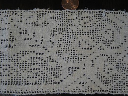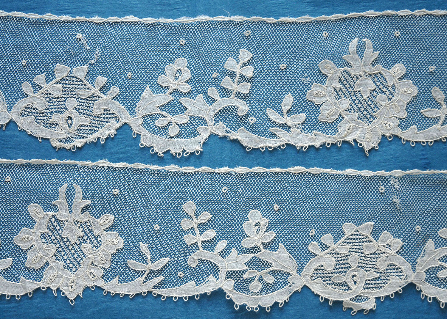 Comments: A border of Carrickmacross applique on machine net. Typical looped edge, and note also the little lozenges along the upper border. That’s another Carrickmacross feature sometimes seen, but not often because borders like this are a bit unusual. There’s a little fraying in the cloth in spots, and a few pulls in the ground. Basically good condition.