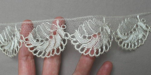 Comments: A narrow border of Blonde de Caen with a fine leaf design. This is such a delicate lace and doesn’t often survive from around the mid 19th century. Seller cites two tiny holes – basically very good condition.