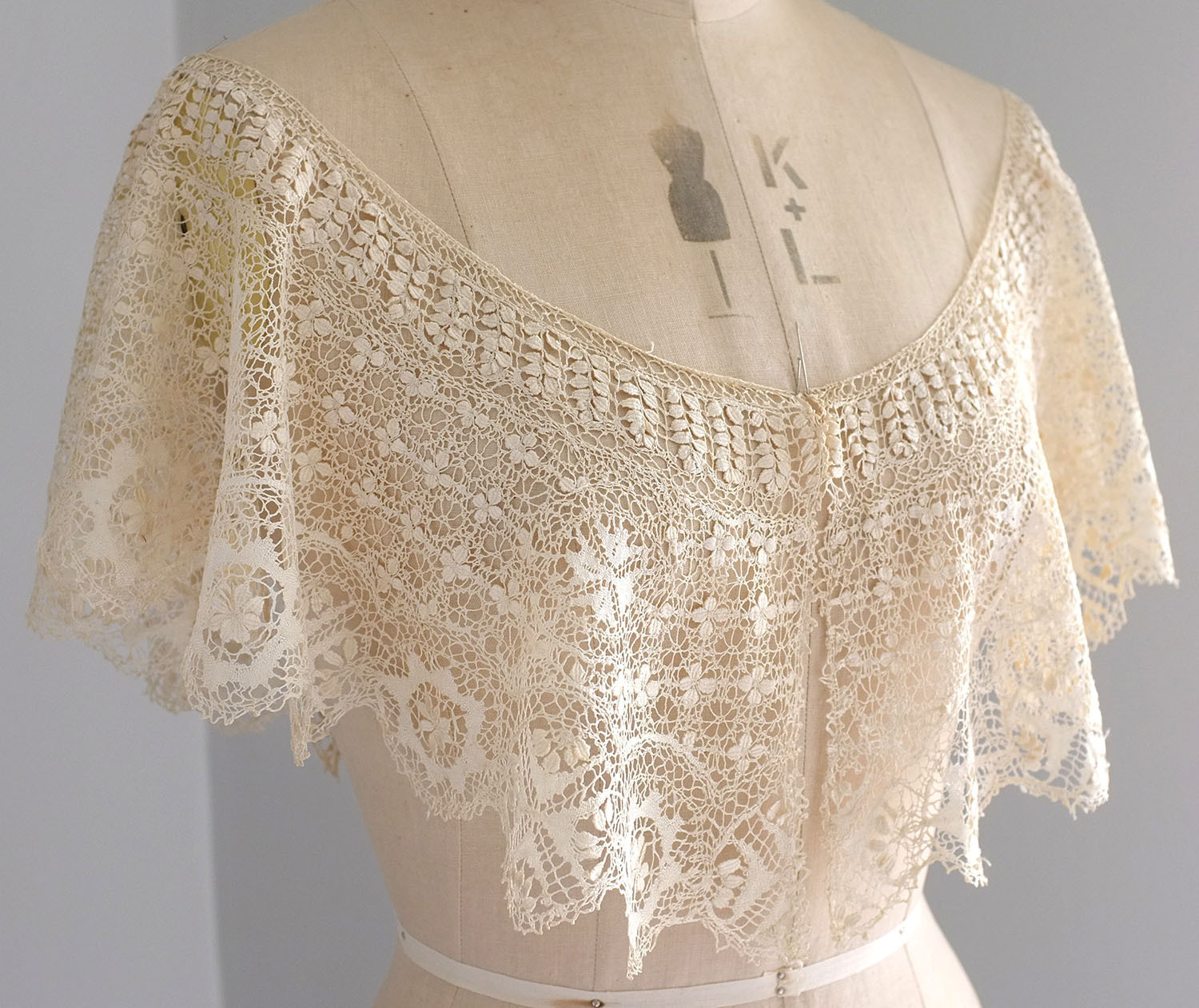 Comments: A bertha of cream silk Maltese. Typical outer border of alternating flowers and Maltese crosses, with vertical wheat ears along the neckline. This seems to be a very typical pattern in Maltese, you also see it a lot in handkerchiefs. The inner part is where these laces differentiate themselves and can really shine. Here there’s a rather spidery square pattern in the ground with woven leaves at the corners, and an occasional Maltese Cross. Looks basically in very good condition.