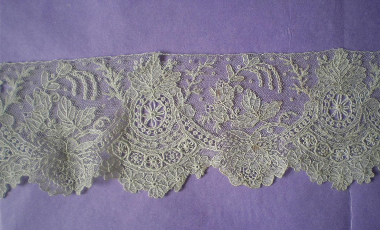 Comments: A Le-Puy looking wide border with an interesting plaited ground. Note the areas of point ground with embedded motifs, and the long chains of narrow leaves. Possibly made in two bands, I’m not certain of this, but seller cites some racroc joins. One seam 25″ from one end. Overall good condition.