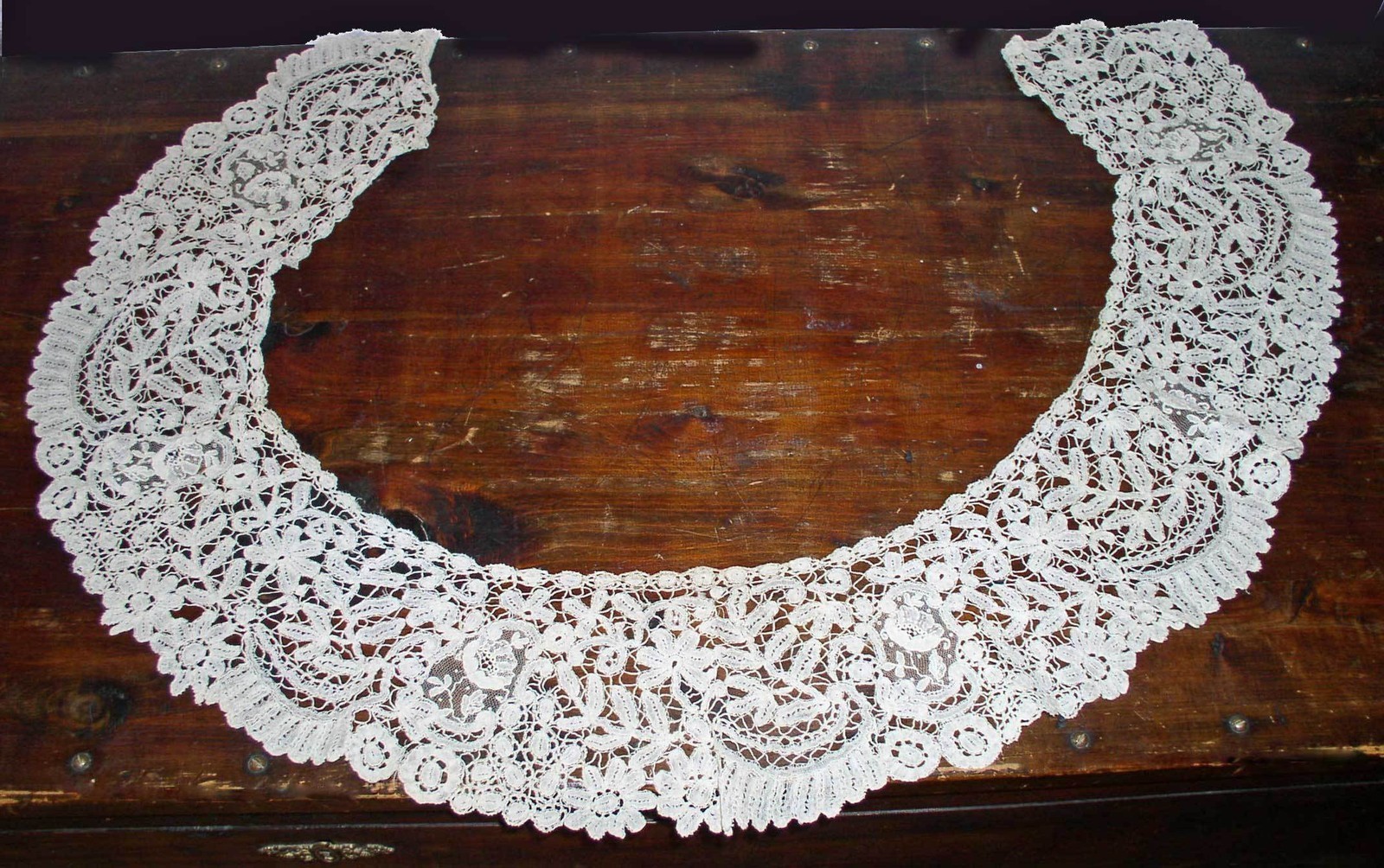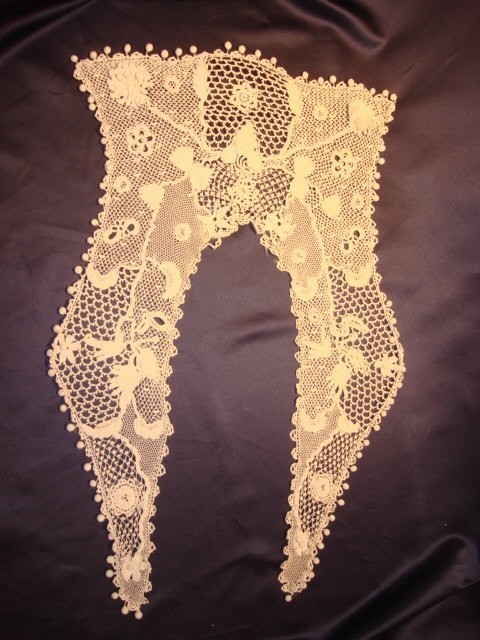 Comments: A Duchesse collar with long points, no needlelace inserts. Some raised work in the bobbinlace, fairly typical designs with irregular picoted bride ground. A few broken brides, and seller notes a storage odor – overall good condition.
