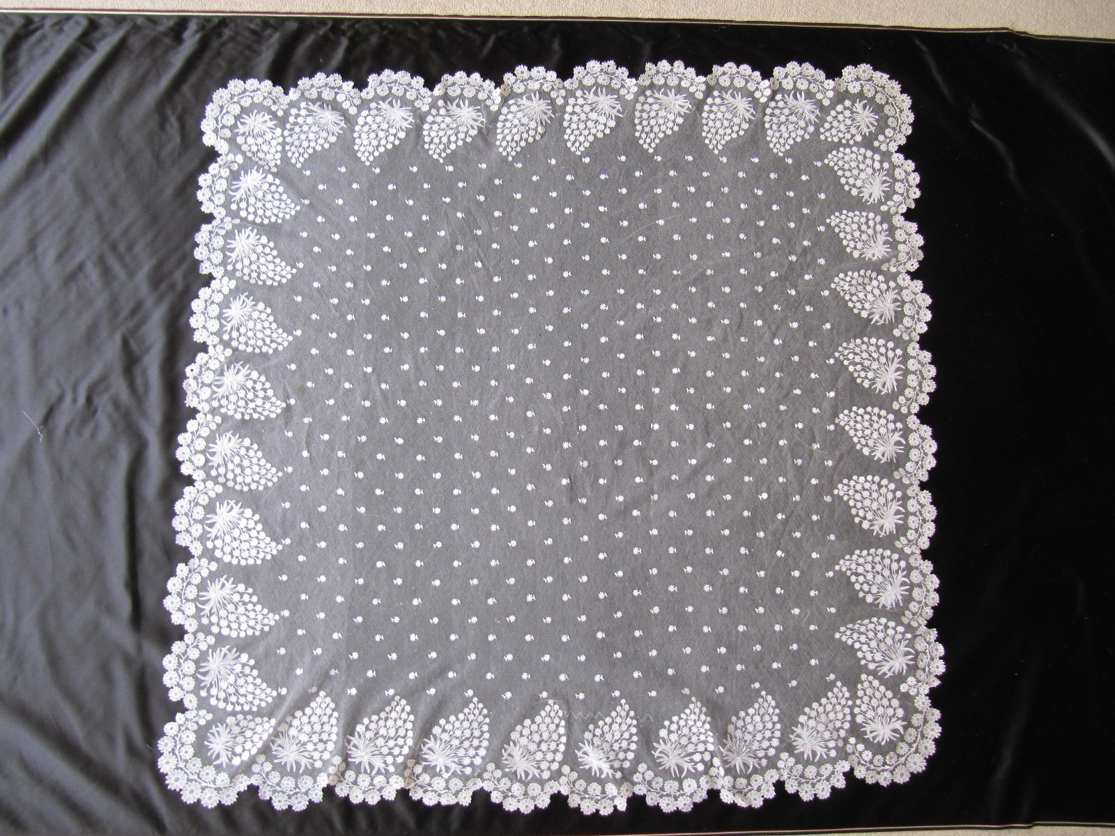 Comments: A lappet scarf of Brussels bobbinlace applique on machine net. I was considering Honiton on this, but the motifs are too densely worked, and the fillings more varied. Seller cites 3 tiny holes and come browning, generally good condition.
