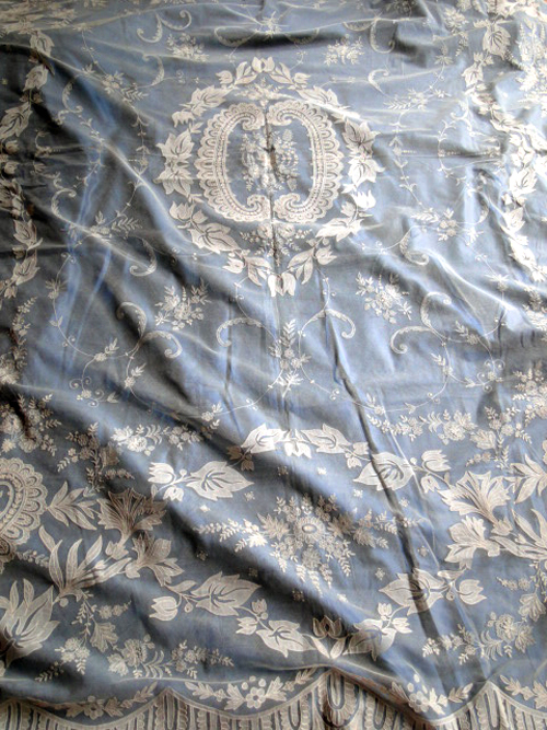 Comments: A large spread of applique on machine net, also with a lot of tambour embroidery. Not sure if the motifs are tamboured on, photos not close enough to tell. Thy are carefully done with a good naturalistic design. Likely Belgian work. It is back with blue silk, which probably accounts for the generally very good condition.